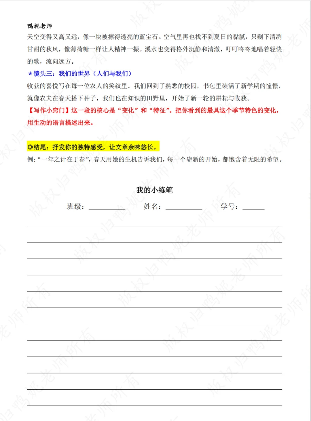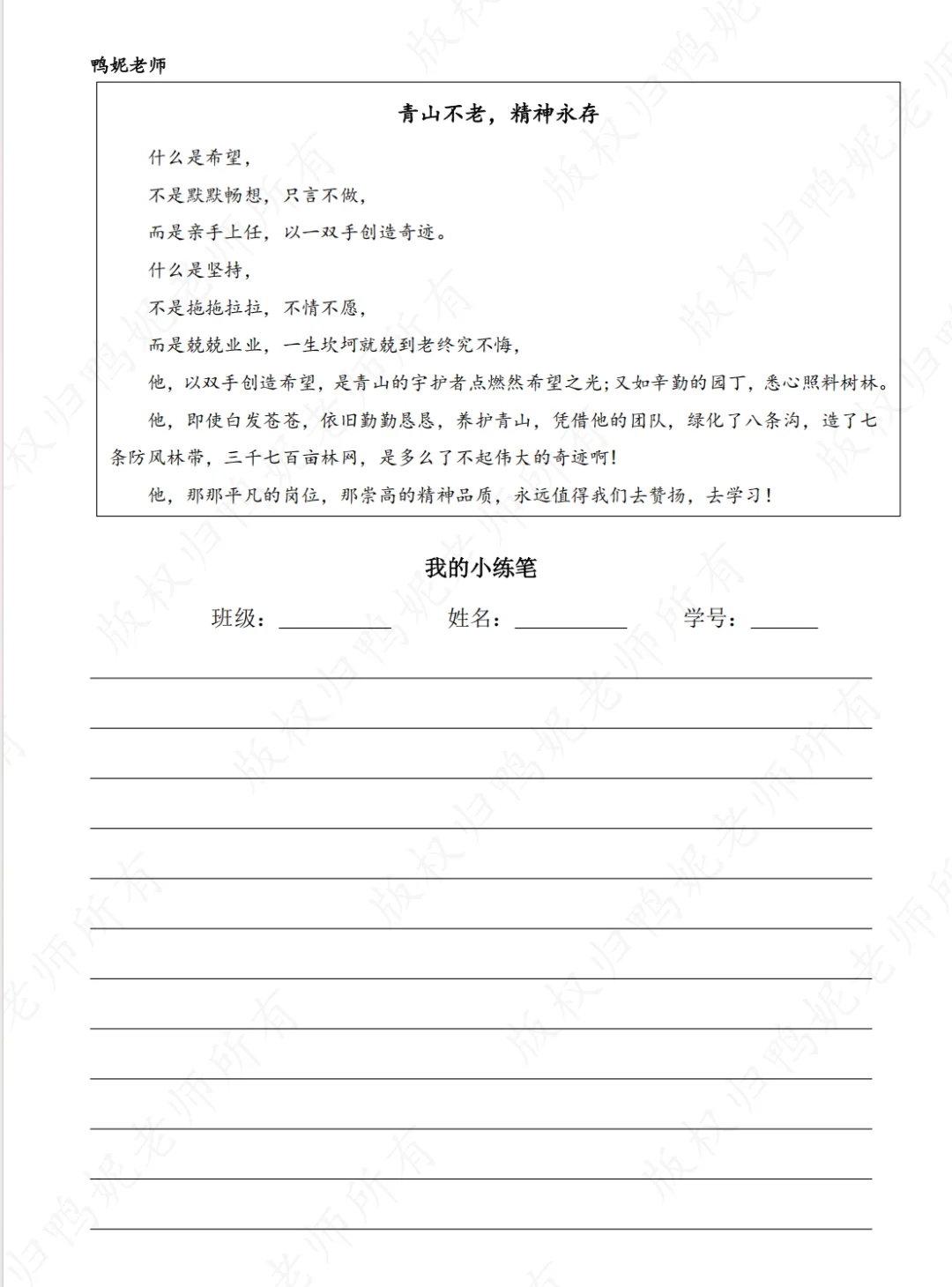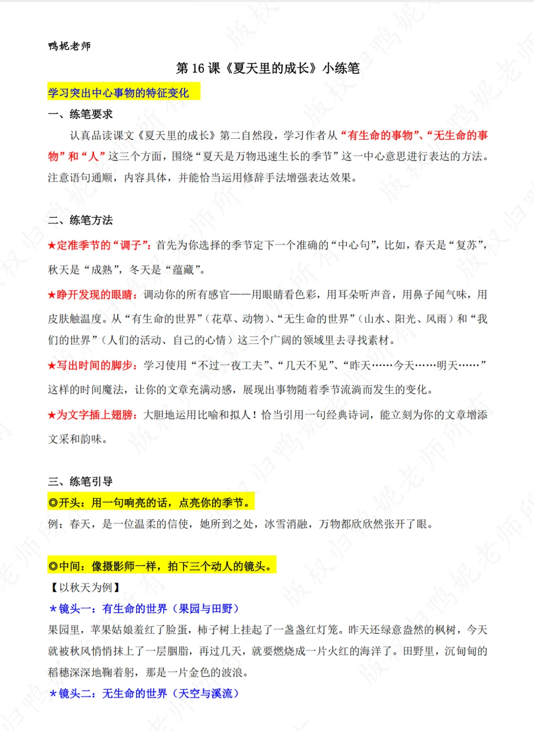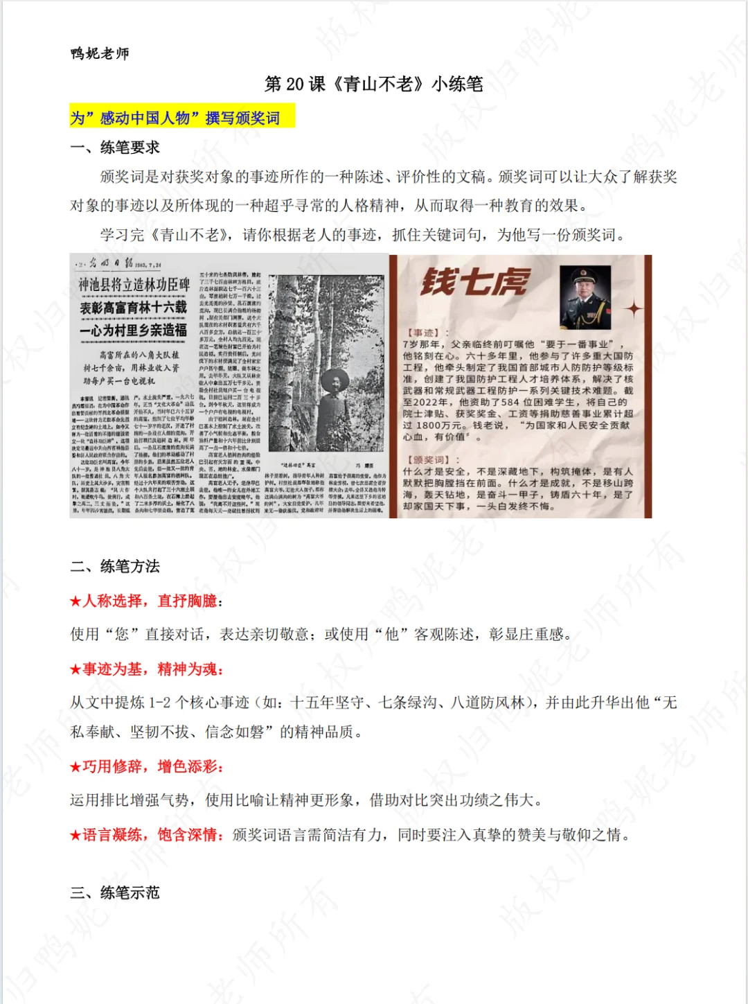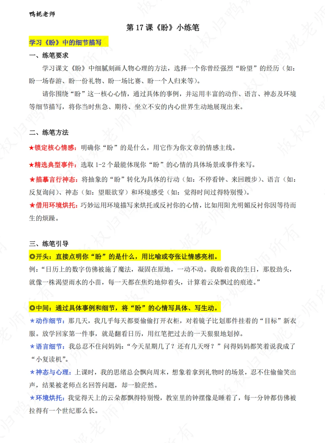大家都上这么快了嘛!粉丝宝宝追得不行[笑哭R]马不停蹄赶出第五、六单元的小练笔 🍃鸭妮老师的小练笔提供方法,练笔引导和实例辅助学生写,很大程度降低了练笔难度。 [向右R]练笔一:学习突出中心事物的特征变化 [向右R]练笔二:学习《盼》中的细节描写 [向右R]练笔三:为“感动中国人物”撰写颁奖词