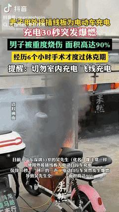 “代价太大了!”深圳,男子像往常一样将电动车推入屋内充电,不料短短30秒就发生爆燃,全身90%面积烧伤,经过6个小时的手术,男子才经过了休克期,保住了性命,网友:以前专家就说铅酸电最稳定。 据齐鲁晚报10月15日的报道 33岁的吴先生今年10月用外接插线板给电动车充电时,电池突然爆燃火苗瞬间窜起把他吞没。家人听到巨响后冲进来,看到他已经倒在地上,皮肤烧得通红。救护车赶到后紧急送医,医生诊断全身烧伤面积高达90%,属于特重度烧伤。 手术持续了整整6个小时,医疗团队用了MEEK植皮技术,把仅存的健康皮肤扩大6倍来覆盖创面。吴先生术后在ICU躺了好几天才熬过休克期,后续还要面对漫长的抗感染和康复治疗。这种痛苦不仅身体受罪,心理阴影更难消除。 电动车起火燃烧速度快,30秒就能吞没整车,火焰温度高超200℃,塑料外壳烧出的毒烟含硫化氢和一氧化碳,吸几口就能让人昏迷,电池遇热还会连环爆炸,根本不给逃生留时间。 电池安全每个细节都要把控到位,从厂家生产到日常使用,每个环节都做到位,才能守住大家的人生安全。 安全使用电动车要记牢:不要进楼入户充电,不要飞线充电,不要混用充电器,不要改装电池,不要超时充电。最好在室外集中充电桩操作,充电时有人看护,闻到焦糊味立刻断电。 各位读者你们怎么看?欢迎在评论区讨论。