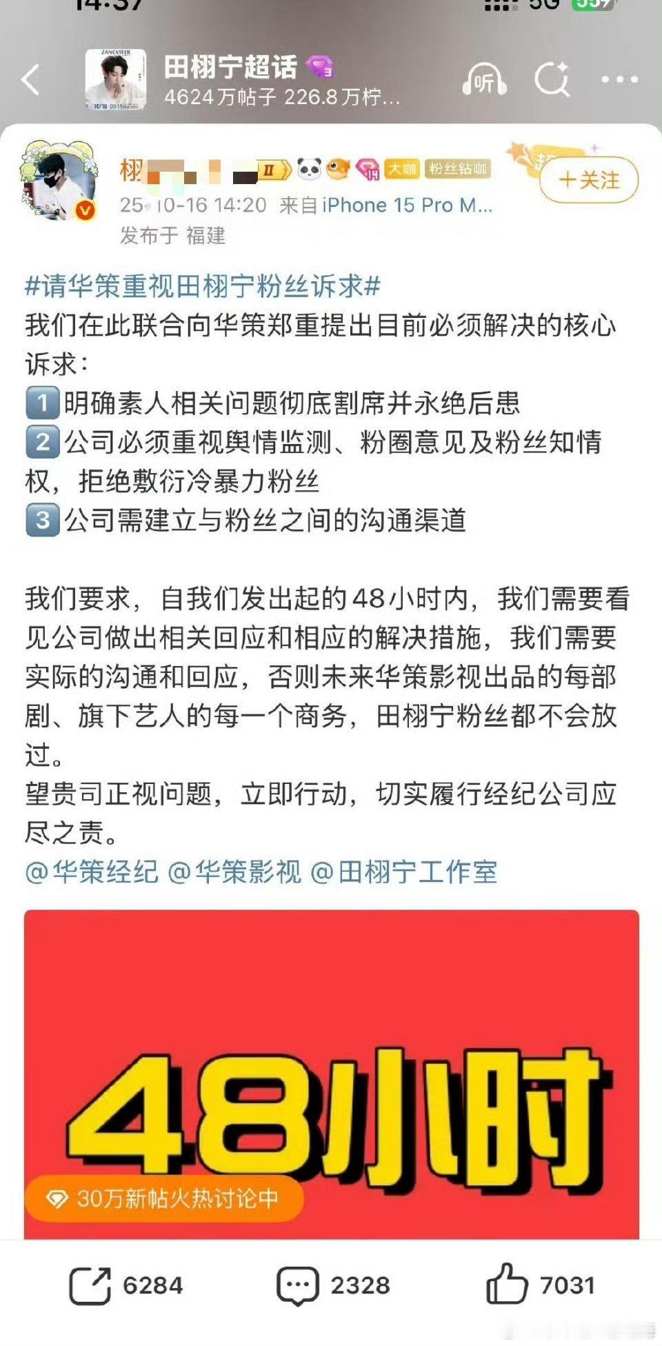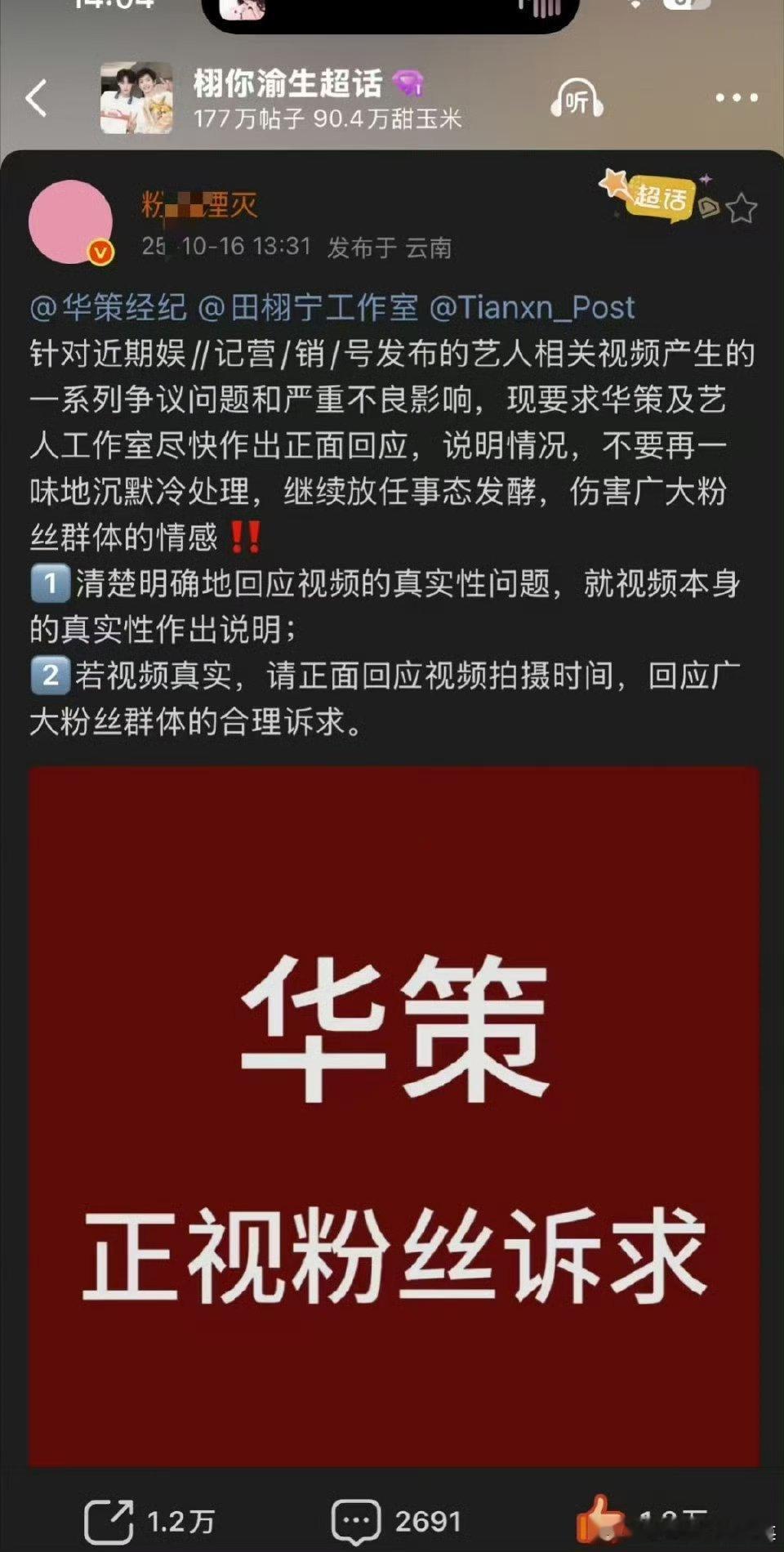 粉丝请求华策正视粉丝诉求,正面回应田栩宁牵手视频真伪,和视频拍摄时间。大家觉得他