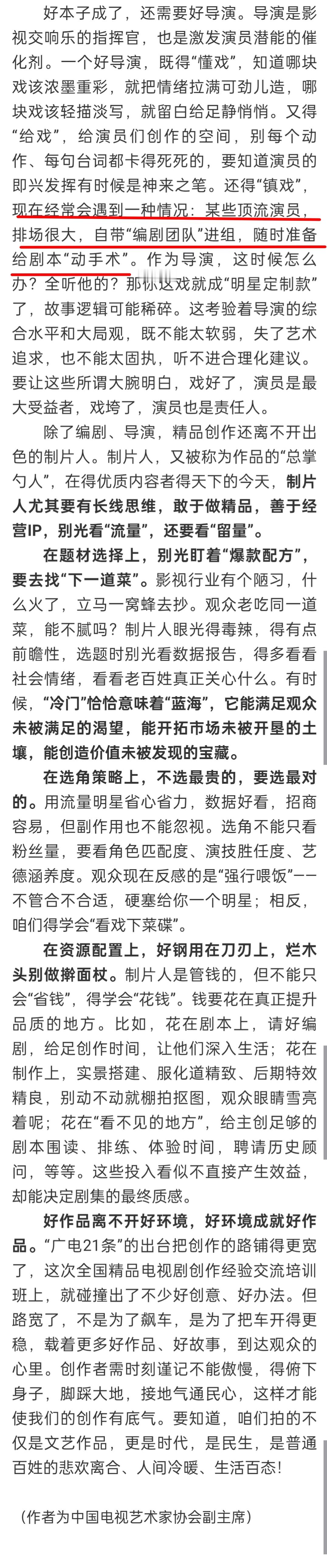 林永健人民日报发文:「现在经常会遇到一种情况:某些顶流演员,排场很大,自带“编剧团队”进组,随时准备给剧本“动手术”。」