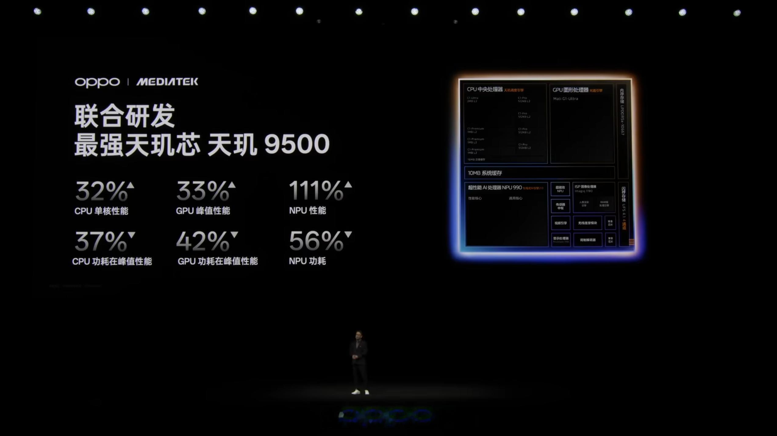 OPPO Find X9 全球首发 OPPO 芯链,联发科天玑 9500 芯片,LPDDR5X 内存,UFS 4.1 闪存。