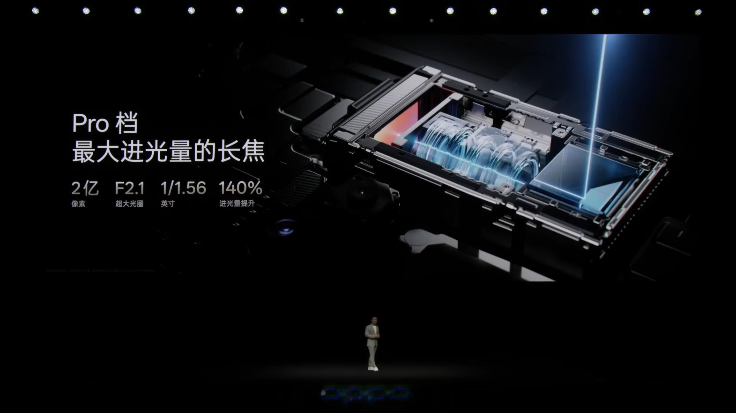 首个拿到哈苏光学认证手机 2 亿像素长焦镜头,f/2.1 光圈,Pro 档进光量最大的长焦。底是 1/1.56" 的三星 S5KHP5。OPPO发布会