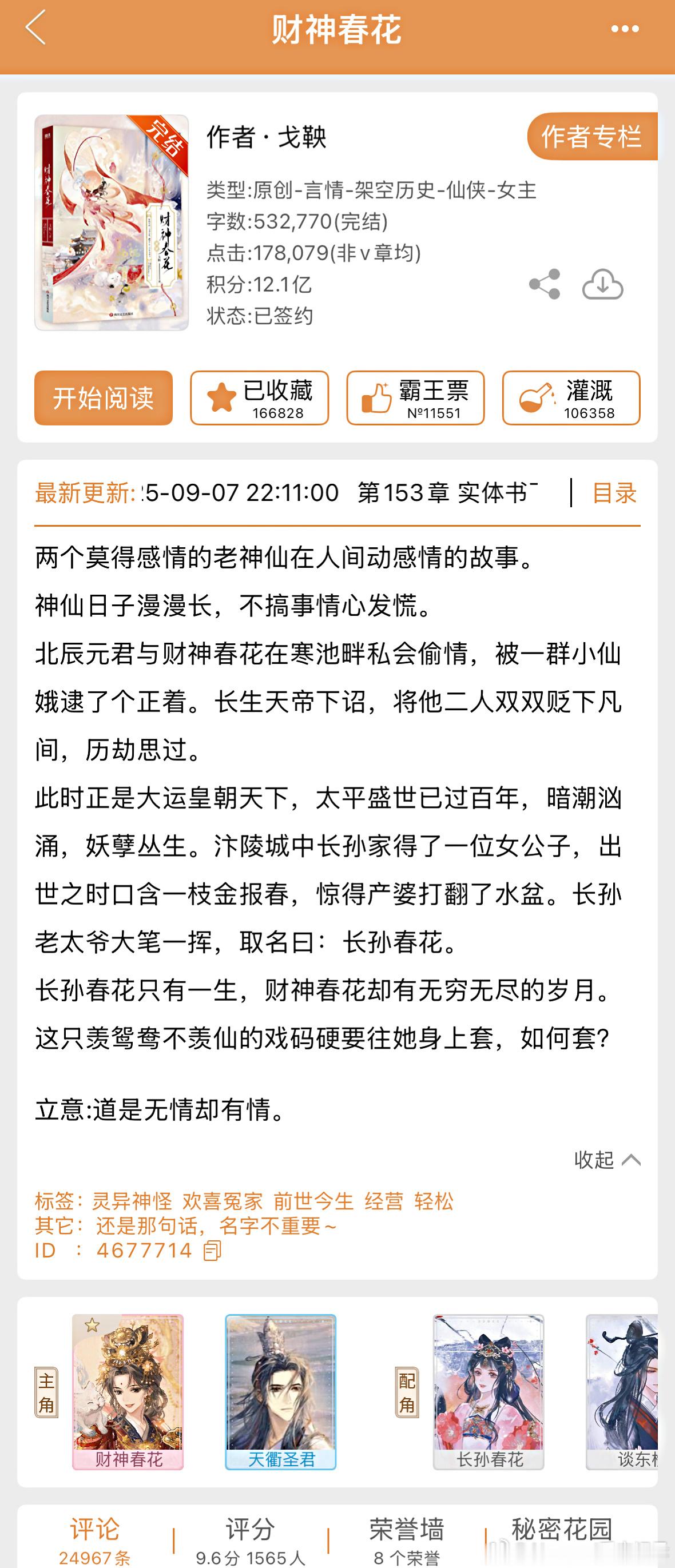 女主财神春花与男二北辰元君因被女二报复陷害有私情而被贬下凡,春花还“误拉”了监刑的男主天衢圣君一同下凡历劫。在汴梁烟火间,春花在商海浮沉间勘破财富真义,天衢于妖雾迷障中淬炼法理至情,恰似双生乔木——根系深扎各自道途,枝叶却在云巅交相辉映。这篇文不同于那些高高在上、充满封建尊卑的仙侠文,它既能看见众生,也能让角色们窥见自我。男女主的爱情也是平等的,互相尊重,生命中不仅只有彼此,也有各自的追求和责任。