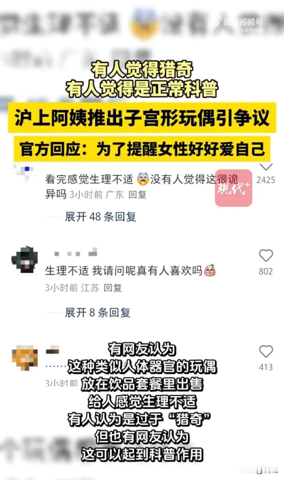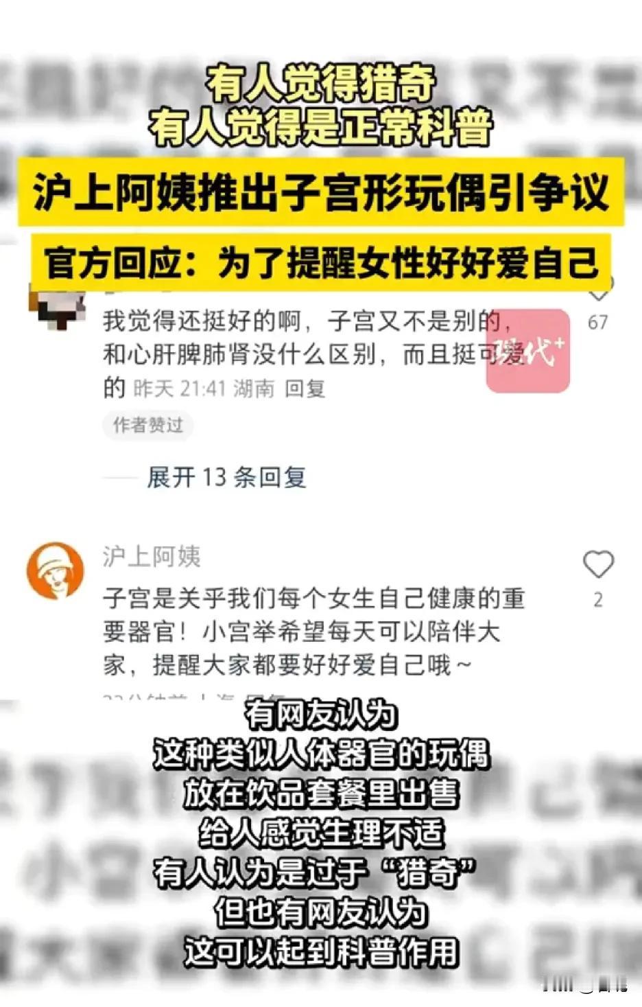 原来这个毛绒的玩偶是子宫啊?不说,我还以为就是新奇玩偶。 沪上阿姨最近因“小宫举”玩偶吵翻了天,双杯套餐送的毛绒玩具被指像子宫,连输卵管、卵巢造型都清晰,粉、红两色还对应女性生理周期。 所以争议什么?哪个人不是从这个器官里出来的?又不是性器官,这跟心脏、脾胃、肾脏一样,都属于身体的器官。可以有肾宝宝,为什么不能有子宫宝宝? 官方回应说要传递悦己理念,市监局也说不违反公序良俗,说明没触碰底线。 我倒觉得这种出现就跟卫生巾一样,多出现大众的视野里,让大众习以为常,科普一下常识也是好事。毕竟有些男的还认为月经就跟憋尿似的,可以一次性释放。 当然一样东西出来,肯定有人喜欢,有人不喜欢,不喜欢可以不买。这有什么猎奇的,好争议的?