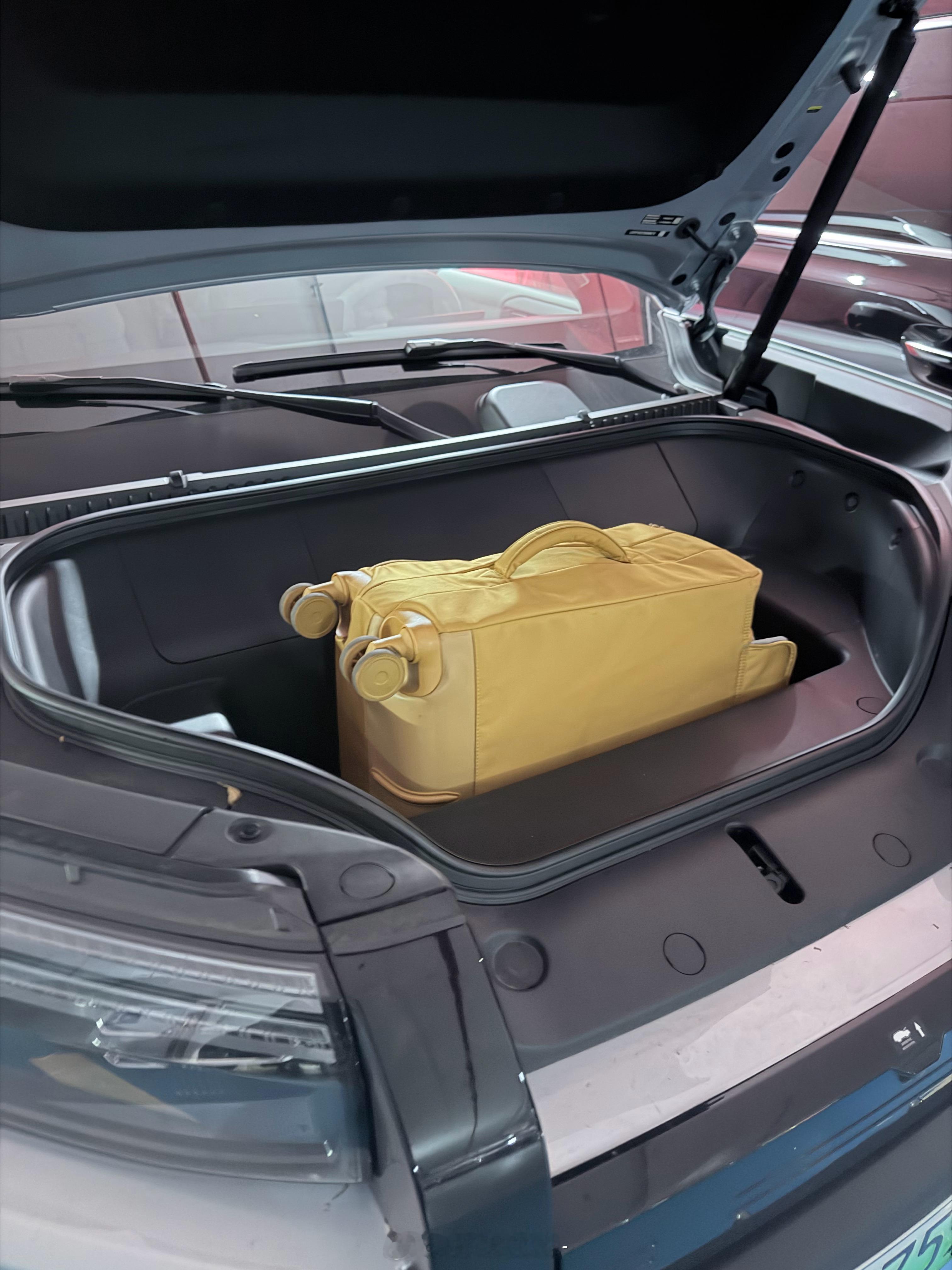 但是有了前备箱,我的钛3后备箱也几乎没怎么用过~因为容量确实够用,看似我的登机箱突出一截,但实际上还有空间(对了下面还有个挡板我没拿出来,还能更深入)