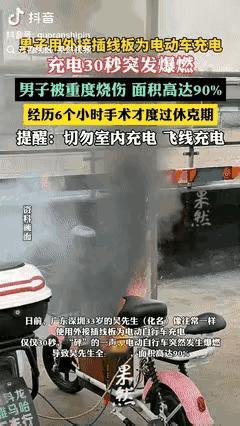 “男子用外接插线板为电动车充电,充电30秒突发爆燃,男子被重度烧伤面积高达90