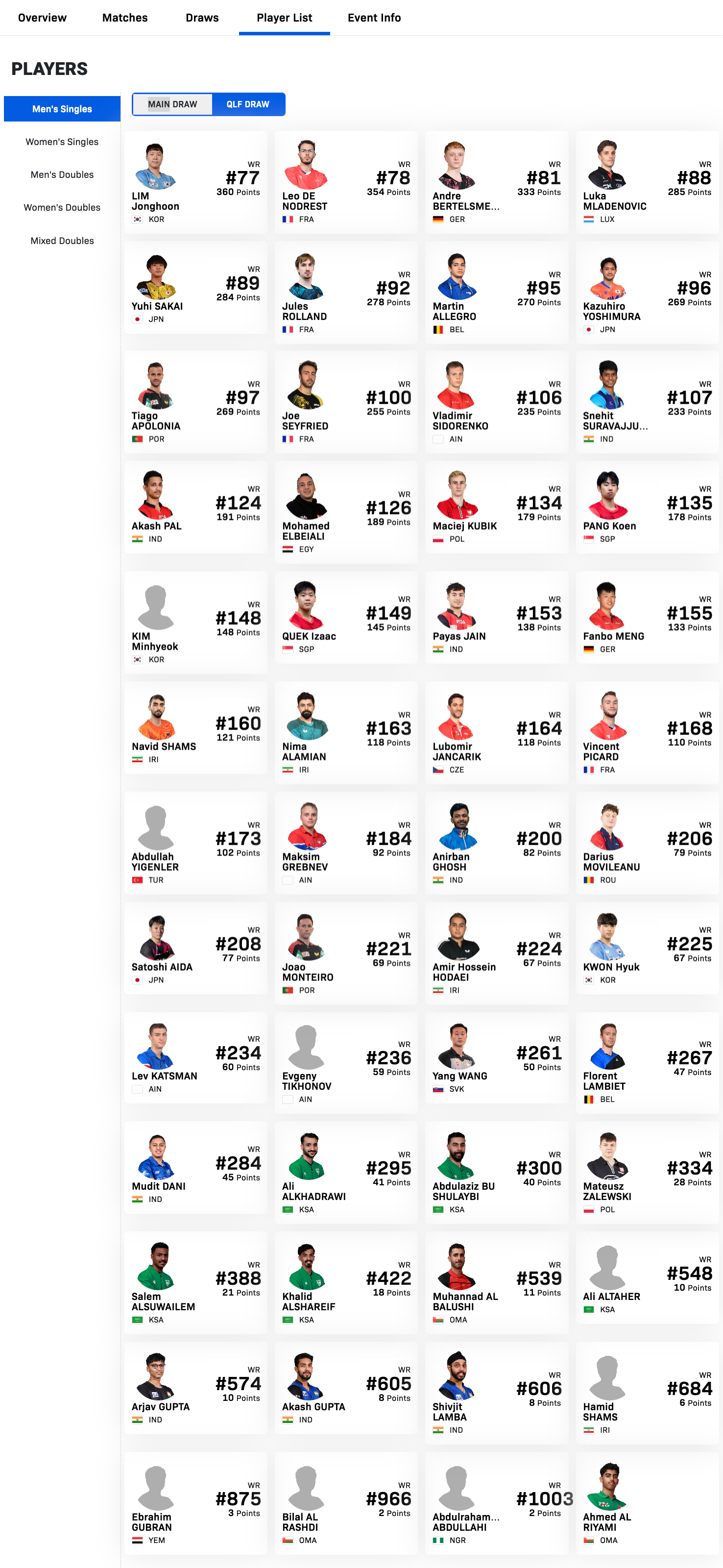 WTT球星挑战赛马斯喀特站11.17-11.22丨男单参赛名单