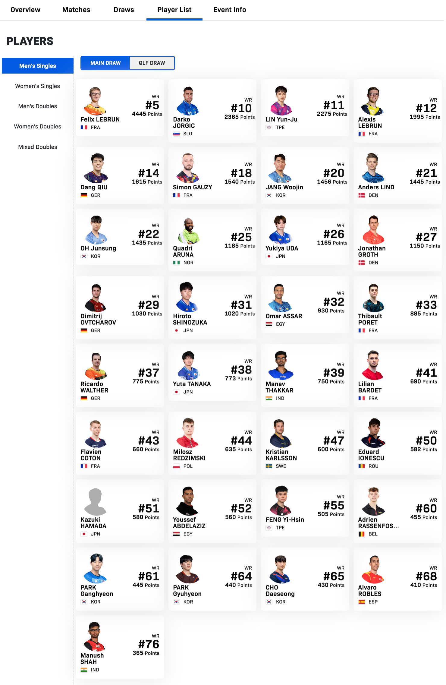 费利克斯·勒布伦🇫🇷、达科·约奇克🇸🇮、林昀儒(中国台北)、艾利克斯·勒布伦🇫🇷、邱党🇩🇪、西蒙·高茨🇫🇷、张禹珍🇰🇷、安德斯·林德🇩🇰、吴晙诚🇰🇷、夸德里·阿鲁纳🇳🇬、宇田幸矢🇯🇵、约纳坦·格罗特🇩🇰、迪米特里·奥恰洛夫🇩🇪、篠塚大登🇯🇵、奥玛·阿萨尔🇪🇬、迪博·泊雷特🇫🇷、理卡多·沃尔瑟🇩🇪、田中佑汰🇯🇵、曼纳弗·维卡诗·塔卡🇮🇳、力廉·巴德🇫🇷、弗拉维安·科顿🇫🇷、米洛什·雷德齐姆斯基🇵🇱、克里斯蒂安·卡尔森🇸🇪、爱德华·约内斯库🇷🇴、滨田一辉🇯🇵、约瑟夫·阿卜杜勒·阿齐兹🇪🇬、冯翊新(中国台北)、阿德里安·拉森福斯🇧🇪、朴康贤🇰🇷、朴奎炫🇰🇷、赵大成🇰🇷、阿尔瓦罗·罗伯勒斯🇪🇸、玛纳什·沙🇮🇳