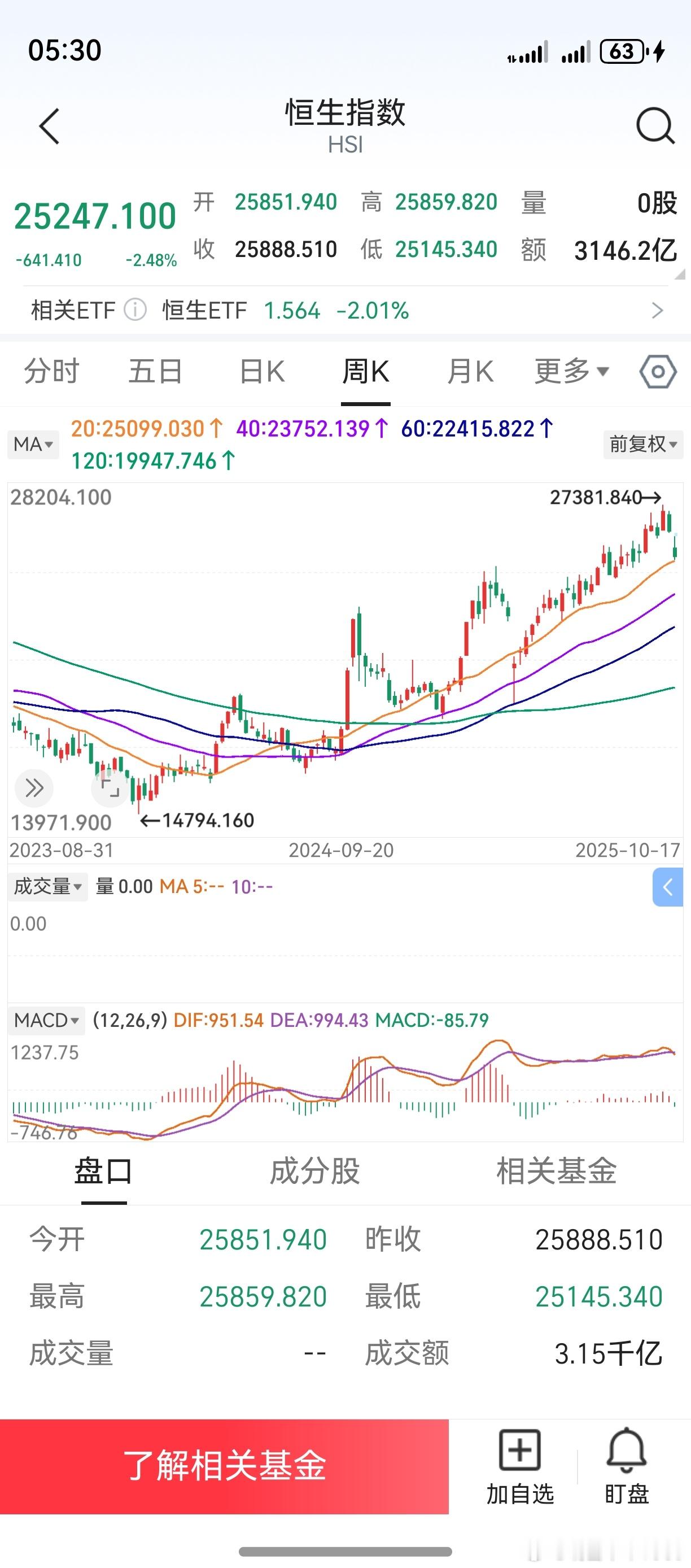 老鸭晚上加班,偷空手机上看看。恒生指数,周线macd第一根绿柱,能不能再次构成买