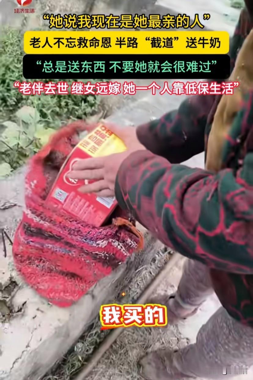 江苏睢宁,老人感念男子七、八年前的救命之恩,有好东西总想着给男子送来。男子:她说我现在是她最亲的人。总给我送东西,我不要,她会很难过。 胡先生是一位农机手,农忙季节开着收割机到田里干活。七、八年前被胡先生救助过一命的老人得知胡先生在地里干活,她背着一箱八宝粥拄着拐杖就来找胡先生。 老人要把八宝粥送给胡先生,胡先生问老人这八宝粥哪里来的?老人说是自己买的,特意买来送给胡先生吃。 胡先生推托着不要,让老人拿回去自己喝。老人却不愿意,执意要把八宝粥送给胡先生。 胡先生看着年迈的老人他真不想收。他对老人说:你拿回去自己喝,我现在比较忙,等我有空了去看你,你要把自己身体照顾好。 老人看到胡先生不要八宝粥,她问胡先生为什么不要?问完话老人忍不住哭了。 看到老人这样,胡先生只好说:我为你节省一点。老人一听这话,忍不住哭出声。 胡先生看到老人这样,于心不忍,便说:那我拿一瓶,其他的你拿回去自己喝,你要听话。老人看到胡先生只拿一罐八宝粥,她不乐意,硬是拿了四罐给胡先生。 看到老人这样,胡先生知道自己再不要,老人又该难过了。因为老人每次给胡先生拿好吃的,要是胡先生不要,老人就会很难过。 胡先生拿了四罐八宝粥后,他让老人先回去,因为这里农机工作时太吵。他还交代老人要照顾好自己,有事就给他打电话。等老人离开后,胡先生又继续忙活。 胡先生说自己每次到地里干活,只要碰到老人,老人都会拿好吃的送给自己。如果自己不要,老人就会很难过。 老人其实也是个可怜人,老伴去世,继女远嫁四川,对她不怎么过问。如今的老人是独自一个人住。 在2017年还是2018年的时候,老人从农用的三轮车上摔了下来。因为年纪大,这一摔可伤得不轻,甚至是寿衣都穿上了。 因为是本村,胡先生也到了老人的家里。胡先生看到老人还有一口气在,他觉得这样做不妥。便自掏腰包把老人送医救治。后来胡先生又经过亲戚和同学陆陆续续给老人捐了5235块钱。 或许是送医及时,或许是老人命不该绝,送医后没过多久老人活了过来,并且情况一天比一天好起来。 事后老人从旁人那里得知胡先生对自己的帮助,她很是感激,感恩胡先生救了她一命。后来老人出院后,胡先生有空的时候都会去家里看望老人,并给老人带去日常生活用品。 看到胡先生对自己这么好,老人的心里都一一记着。特别是在她老伴去世后,老人抱着胡先生痛哭,她觉得自己在这个世界上没有依靠了。 胡先生安慰老人,称自己会照顾她,也让她有事随时找自己。 而胡先生的话也不仅仅是说说,他在行动上也真的做到了。他会尽自己力所能及的去照顾老人,久而久之老人也把胡先生当成最亲的人。 老人看到胡先生对自己的好,她也在尽自己所能去对胡先生好。虽然她是领着低保生活,可她愿意买一箱八宝粥给胡先生。 因为在她心里,她觉得这粥在胡先生干活累了饿了的时候能够补充能量。而老人的这番心意,胡先生又何尝不知,他也知道老人不容易。这对平凡人的点点滴滴都在为对方考虑。