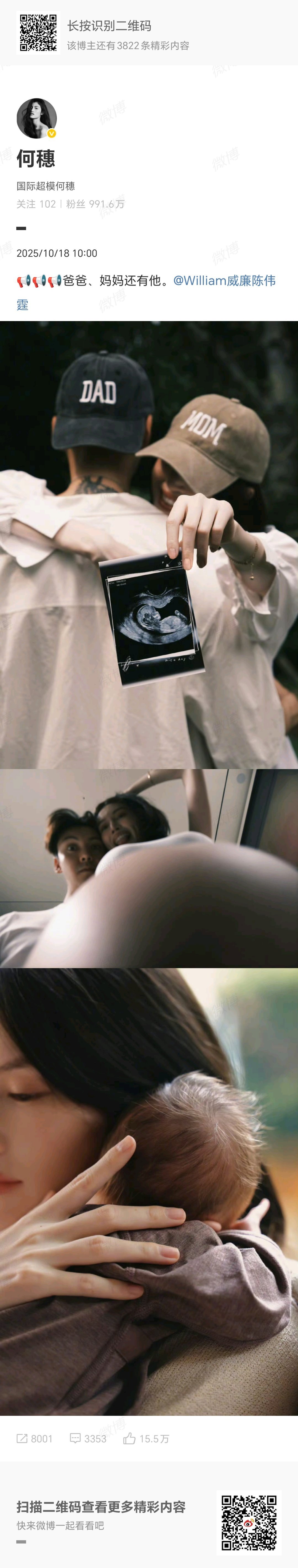 #陈伟霆何穗官宣生子# 18日,晒出B超照、孕期照、和儿子的合照官宣得子:“📢📢📢爸爸、妈妈还有他。”据悉,两人在2021年8月被拍到同回住处,恋情曝光。 #陈伟霆何穗什么时候在一起的#