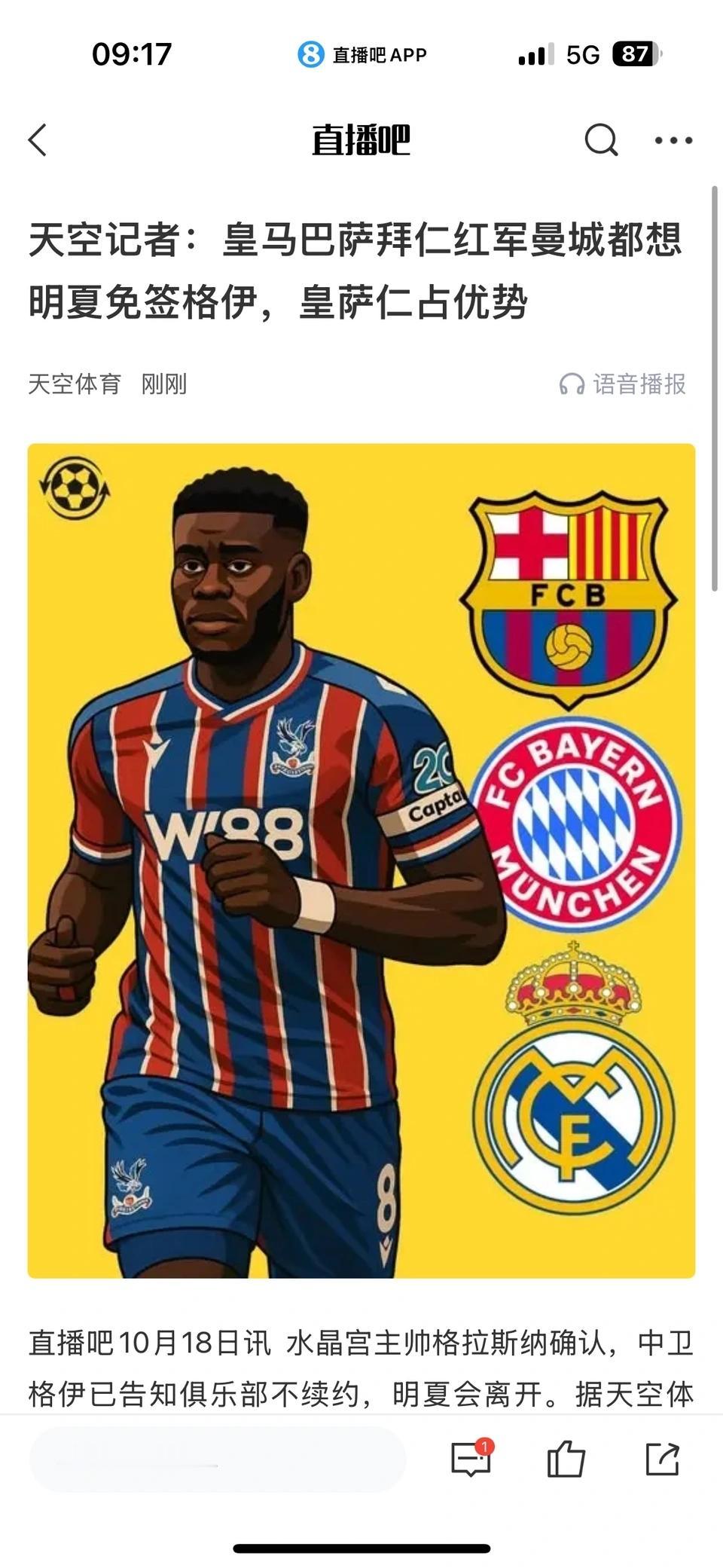 欧洲五大豪门都想免签格伊,你要是他去哪里? 去巴萨,拿西甲冠军毕竟容易。 去皇马,争西甲拿欧冠很简单。 去拜仁,年年都是德甲冠军。 去利物浦,争一下英超冠军。 去曼城,想办法开启二次王朝。 甚至意甲豪门也想拥有他,免费的谁不想要呢! 格伊估计眼睛都花了,去哪才是美好的未来呢? 反正水晶宫不能待了,早就说不续约了,马上教练都要跑路,别怪格伊![笑哭]