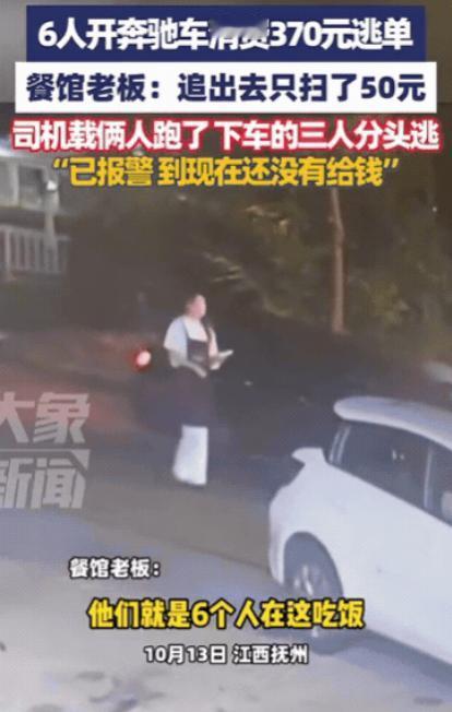 “丢奔驰车主的脸!”江西抚州,6人开奔驰车去餐馆吃饭,老板本以为来大单了,没想到,6个人消费370元后,竟然趁老板不注意,陆陆续续离开逃单,老板发现后追出去,结果,扫半天只扫出来50元,然后几人分头跑了,老板无奈选择报警! 那天傍晚,抚州市中心的一家中档餐馆正迎来晚餐高峰。老板黄先生和妻子忙得脚不沾地。就在这时,一辆黑色奔驰缓缓停在店门口,引起了不少路人的注意。 车身光亮如镜,车牌是一副熟悉的省会号段,看起来不凡。6名男女下车,穿着得体,男的西装皮鞋,女的手拎名牌包,一副“成功人士”的派头。 黄老板见状,心想这肯定是一桌“大单”,便亲自上前招呼:“几位贵客,楼上有包厢,需要吗?” 其中一名年轻男子笑着摆摆手:“不用了,就随便吃点,朋友小聚。” 他们点了不少菜:剁椒鱼头、红烧肉、清蒸甲鱼、干锅肥肠,还有两瓶啤酒、一瓶果汁,总共消费370元。 黄老板记得很清楚,几人吃得津津有味,还时不时举杯碰杯,聊天内容颇有“生意经”的味道——什么“项目签约”、“公司资金周转”,听起来风生水起。 晚饭接近尾声时,黄老板的妻子发现几人陆续起身,有人去洗手间,有人到门口“接电话”。起初她没多想,心想也许他们吃完饭要抽烟透透气。 可几分钟过去,店里只剩下最后一个穿白衬衫的男子。他低头看了看账单,掏出手机,对老板说:“我来结账。” 黄老板立刻递上二维码。男子假装扫码,手机在屏幕上停留几秒后说道:“好了,我转了。” 黄老板手机当时有顾客催单铃声,他没留意到账提醒,就继续忙去了。 可过了十几分钟,他才发现事情不对劲——那几位客人全都走了,车也不见了。 他赶紧拿起手机打开收款记录,结果傻眼了:并没有收到370元的转账。 老板又以为是网络延迟,刷新了几次,依旧没有记录。于是他追出门口,发现马路对面空空如也,只剩下地上几片餐巾纸被风吹得打转。 他急忙翻看监控录像,才彻底明白过来:原来几人是分批逃走的——第一个男子假装去抽烟,其实直接上了车。 随后两名女子借口“买单太慢”离席,最后的那名白衬衫男子假装扫码,趁老板转身的一瞬,也快步走出门外。 黄老板气得直跺脚,立刻拿着手机追出去,可等他跑到街角时,那辆奔驰已经发动,呼啸着离开,只留下滚滚尾气。 他不死心,拿起手机扫了那人假装扫码时留下的二维码,结果扫出来的金额是50元。那人根本没输入正确金额,只是设置了“自定义金额支付”,随便转了个象征性的数字就走人。 “吃了370块的饭,只给我50块,还跑得比谁都快!”黄老板越想越气,最终报警求助。 警方接警后,很快调取了餐馆及周边的监控录像。根据车牌信息,确认那辆奔驰登记在南昌一名男子名下。 通过车辆轨迹追踪,警方发现当晚车子离开抚州城区后,直奔市郊方向,途中还在一家便利店短暂停留。 民警分析,6人中可能有人有意策划这次逃单行为,而车主极有可能就是主谋。几天后,警方传唤了车辆登记人。 令人啼笑皆非的是,这名男子竟辩称:“那天不是我开的,是朋友借车去吃饭的,我没参与。” 可调查进一步深入后,警方发现,吃饭时坐在主位上的正是他本人。面对监控证据,他哑口无言,只能低头承认。 原来,他们几个是一起做网络销售的“合伙人”,最近资金紧张,本打算吃顿好的“解解压”,没想到吃完却不想掏钱。 有人提议“先走,反正老板追不出城”,于是他们一拍即合,上演了一出“集体逃单”的荒唐闹剧。 事件曝光后,网友们群情激愤。有人讽刺道:“6个人挤一辆奔驰,以为开豪车就体面?其实比路边讨饭还丢人!” 还有人留言:“豪车可以租,素质租不来。” 更有网友表示:“现在真是开宝马的吃泡面,骑电动车的请客吃饭。” 面对网络舆论,黄老板接受采访时无奈地说:“我不是为了那几百块钱,我就是想问一句,人心咋变成这样了?奔驰都能开,咋还赖这顿饭?”