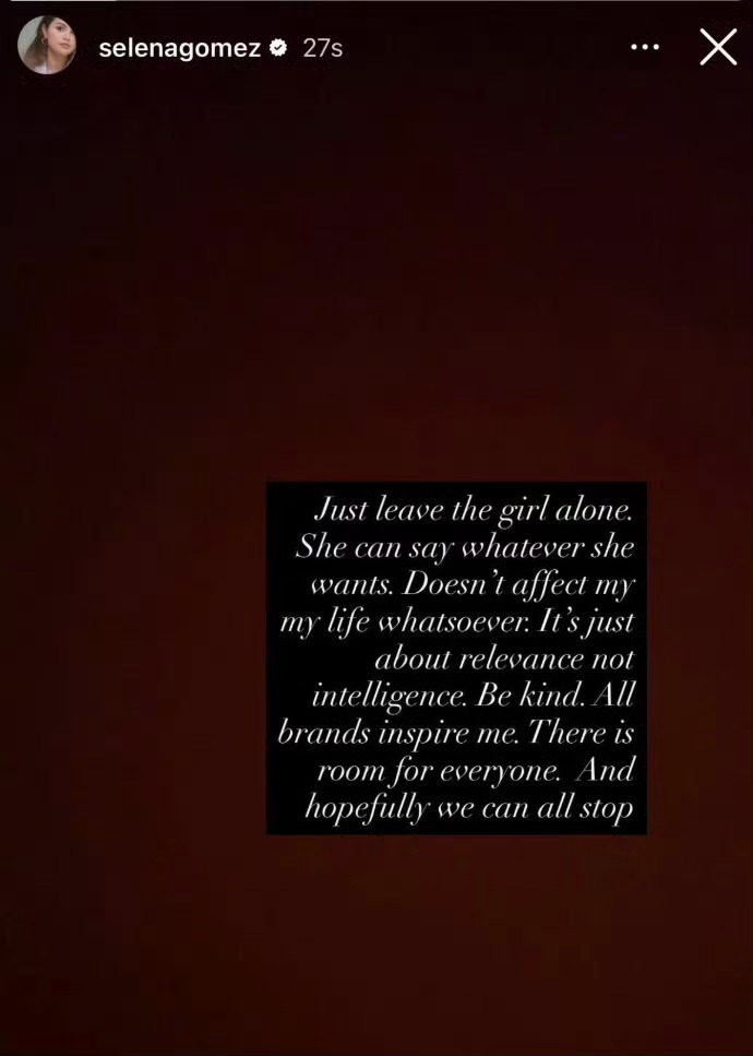 赛琳娜回应海莉,北美意难忘新一季又开始了!前因是,海莉Hailey Bieber接受了采访,采访中被问及赛琳娜Selena Gomez,结果她说:“我不会对那些无法给我启发的人产生竞争感。”然后呢,赛琳娜在ins上回应:“让她自己说去吧。她想说什么都无妨,这根本影响不到我的生活。这只是关乎“话题度”,不是聪明与否的问题。保持善意吧!所有品牌都能给我带来灵感。这个世界上有足够的空间容纳每个人。希望我们都能就此打住。”
