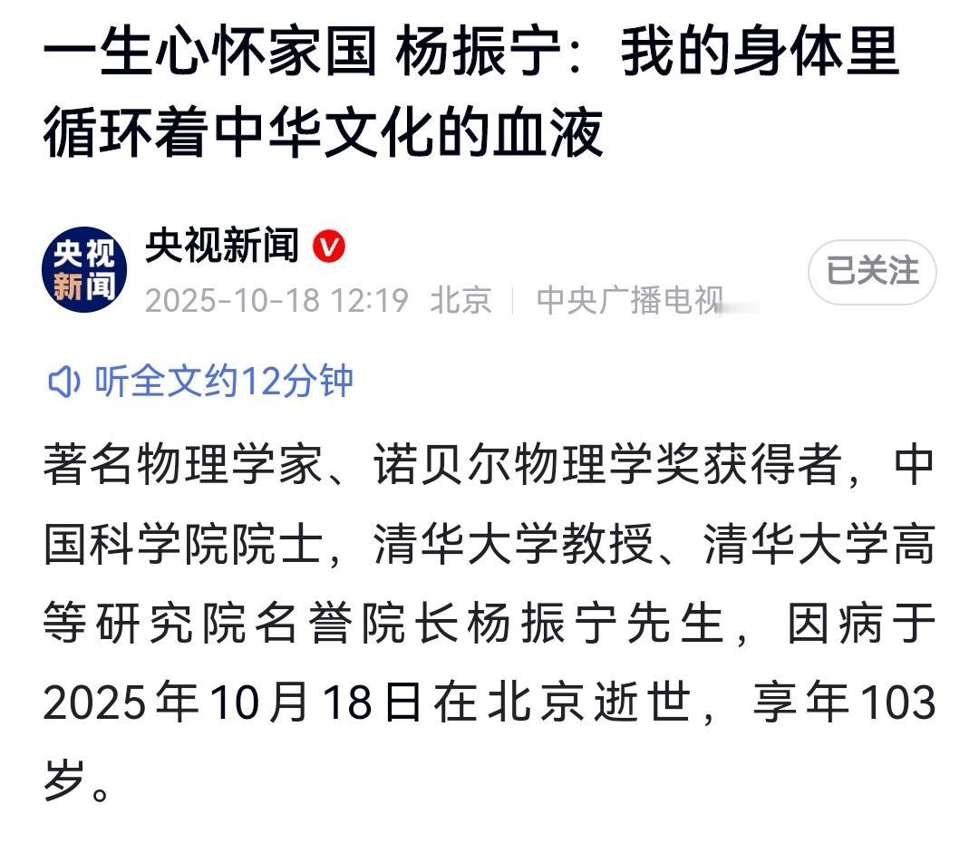 讣告! 著名物理学家、首位华人诺贝尔物理获得者、清华大学教授、清华大学高等研究院名誉孩院长、杨振宁 2025年10月18日在北京逝世,享年103岁。 杨老一路走好!🙏🙏🙏