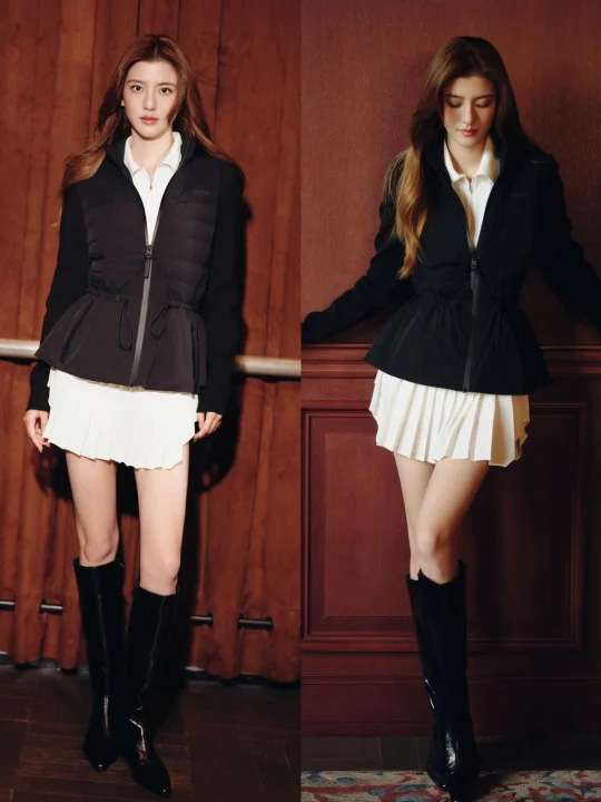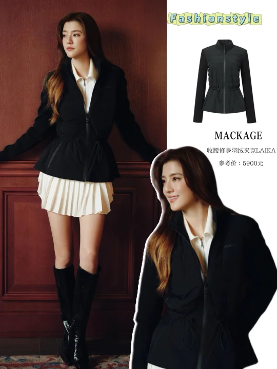 一身收腰羽绒夹克搭配尖头长筒靴,酷飒女人味十足