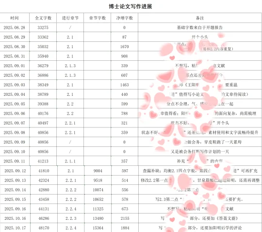 在中研院的时候,吕妙芬老师对我们说:最终决定博论质量的,往往是写博论的时间。[斜眼R][斜眼R] 去年此时,我花了小半年时间精雕细琢开题报告,当时总觉得这样的奢侈投入有点浪费,但现在看来非常值得,内容稍作改造就能成为博论的第一章。 在台北的半年,博论一直停滞,直到8月28日,我才新建第二章文档,坚持每天推进(因办会中断两天),到9月16日完成基础内容。9月下半月转而修改两篇跟博论无关的小论文,写作再次暂停。直到昨天重新捡起来写,在这个平凡的周五晚上,彻底完成第二章,总耗时20天。 没有说我写得快、写得好的意思,但博论初试水的经历让我觉得很奇妙: 1⃣好的选题和合理的提纲是成功的全部,动笔前想好每节要处理什么问题,不要只盲目追求字数。 2⃣文有文气,一旦开始,不要中断。但执行时有很多阻力:生病、办会、出差……别搁置太久,否则找回状态又需要时间。 3⃣总有状态差、不想写的时候,可以选择调整格式、粘贴文献、整理文献库、阅读专著,学习他人的研究方法、材料运用、行文逻辑。 4⃣论文各部分相互关联,有的节点在写到后期进行回溯时才能明白,像研究方法、每章小结、章节衔接等可以暂时搁置,留待日后补充。 5⃣在第一轮写作时就做好记录。脚注把所有信息页码等写完整,建议用表格来记录写作进度以便回溯,一定要及时备份! 接下来,我还想做个写作实验:选取博论中的两章,一组采取大论文的传统写法,一组则先单写小论文、最后整合成章。刚完成的第二章用的是前一种方法,接下来想以第五章为例,试试后一种方法。[大笑R][大笑R] 好想快点写完博论,快进到毕业的那天啊!欢迎有经验的朋友分享写作心得。[色色R][色色R]