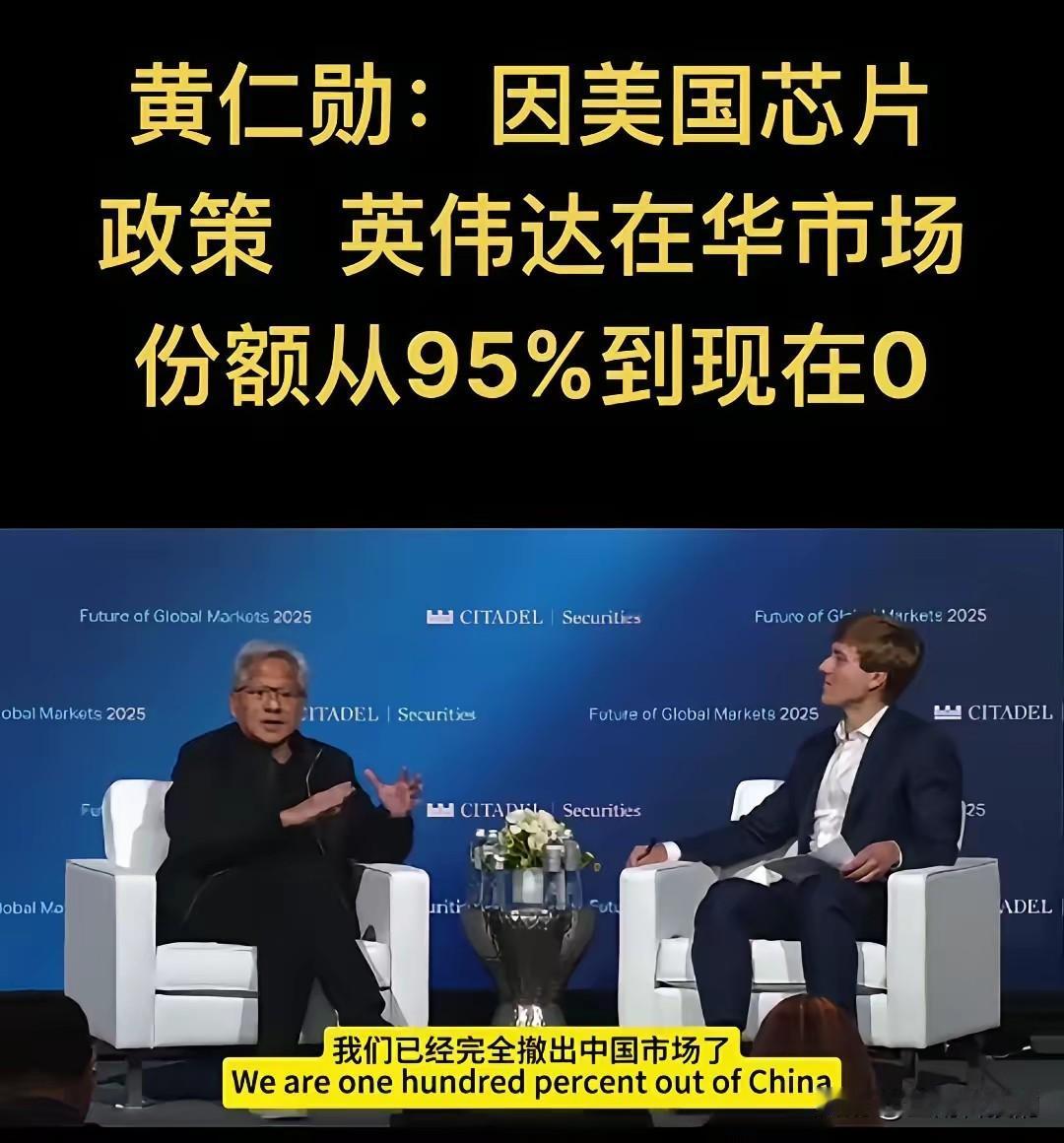 黄仁勋很无奈!出口管制,让美国失去了世界上最大的市场之一。 黄仁勋说了句大实话,因为美国的这个政策,英伟达已经彻底退出中国市场,之前95%的份额直接归零。说白了就是:美国自己定的破规矩,逼着自家最能打的科技公司,硬生生丢了全球最大的市场之一。 美国想在AI竞赛里赢,但现在干的事,就像为了不让对手吃饭,直接把整张餐桌掀了。 老黄点出了关键问题:伤害别人,往往也会反噬自己,而且可能更严重。中国有全世界近一半的AI人才,不让他们用美国技术,长远看,等于逼着他们另起炉灶,建立一套没有美国技术的标准和应用生态。这非但没能限制住对手,反而把世界市场拱手让给了华为这样的竞争者。 说真的,世界就是个圈,大家生意做了几十年,早就绕在一起了。做生意讲究和气生财,国际竞争也一样,关起门来称王,最终可能只是做了一场“孤家寡人”的梦。大家觉得呢?