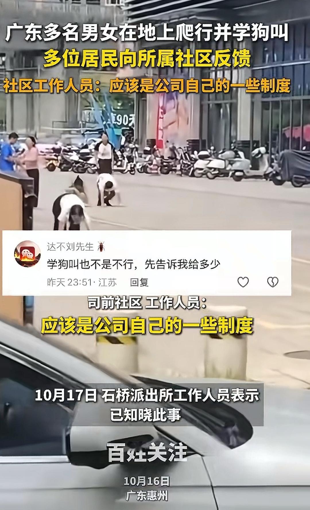 以“团建”为由对人格实行侮辱,这样的企业文化,公司会有进步? 近日广东惠州街头,多名男女四肢着地爬行、模仿犬吠的画面尚未从公众视野中淡去,关于“侮辱式团建”的争议仍在发酵。 涉事企业将其美化为“突破自我”的企业文化,社区一句“公司自己的制度”更让人心惊——当人格尊严沦为企业“管理手段”的祭品,这样的公司,何来进步可言? 屏幕前的朋友们,你们觉得这样的企业文化有前途吗?[来看我]一起来聊聊吧![比心][比心][比心] 广东 团建