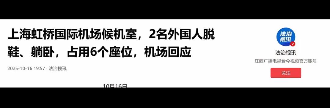 外国游客机场“霸座”,规则面前该咋整? 10月16号上海虹桥机场那俩外国游客可太“出圈”了!别人都规规矩矩找地儿坐,他俩倒好,脱鞋躺连椅上,一人霸三个座,那姿态,仿佛机场是他家开的。周围人皱眉、挪位,找座的大爷大妈干瞪眼,劝阻还遭白眼,一句“滚回自己国家”喊出大家心声。 这事儿背后,暴露的是部分人规则意识淡薄。不管哪国人,在公共场合就得守规矩,这是基本素养。机场回应不搞特殊,值得点赞。但我觉得,除了事后处理,更该加强事前教育引导。大家说,要是再碰到这种不守规矩的外国人,除了谴责,还有啥更好的办法让他们长长记性呢?