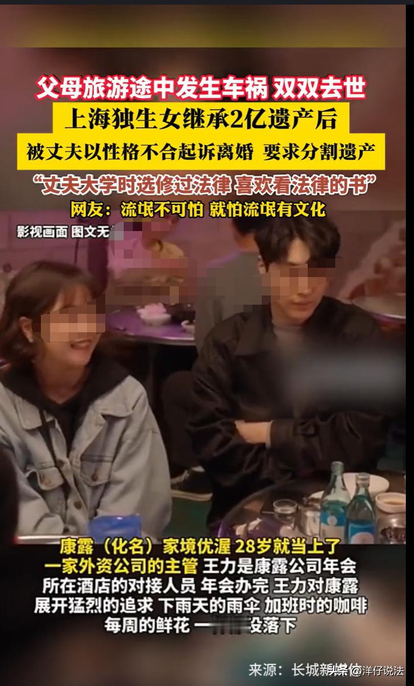 上海,一女子结婚多年,丈夫一直体贴入微,不幸的是,女子的父母在旅行途中遭遇车祸双双离世,没来得及立遗嘱,留下上海的九套房产、商铺及千万金融资产,总值约两亿元。不料,丈夫突然以性格不合为由起诉离婚,并要求分割女子刚继承的父母遗产。女子此刻才想起丈夫曾是学法律的。女子在庭前拦住丈夫质问:“如果我的父母没有这么多遗产,你还会离婚吗?”丈夫平静地回答:“我们早就没感情了。”当被问及凭什么分遗产时,他淡然道:“凭我们的结婚证。”网友感叹:这钱也太多了,一般人经不住考验! 据悉,28岁的康露(化名)是上海一家外资公司的主管,从小到大,生活算得上顺风顺水。 父母是普通的上海商人,靠着多年的打拼,积累了不少家产,在上海有九套房产和商铺,还有1000多万元的银行存款和理财产品,总价值大约2亿元。 三年前,那时,康露刚升任公司主管,负责年度年会,年会地点选在一家高档酒店,酒店方的对接人员叫王力(化名),一个29岁的年轻人。 王力个子高高,说话温和,办事利落,年会筹备期间,经常沟通,他总能提前安排好一切,让王力省心不少。 年会结束后,王力突然开始追求康露,每天送花、发暖心短信,甚至在加班时送夜宵。 起初康露没太在意,觉得这只是工作关系。但王力坚持了整整半年,最终打动了康露,求婚时,说会一辈子对康露好。 康露经不住浪漫,答应了王力的求婚。 婚后,王力确实如他承诺的那样,对康露体贴入微,一切如预期一样美好。 去年春天,康露的父母去外地旅游,途中遭遇车祸,双双去世。 消息传来时,康露整个人都崩溃了,王力一直陪在其身边,帮处理丧事,安慰康露。 父母的后事办完后,康露花了半年时间慢慢调整自己,试图回归正常生活,重新投入工作,但心里总空落落的。 半年后的一天,康露正在公司开会,突然收到一份法院传票。康露打开一看,是王力起诉离婚,理由写着“性格不合”。 康露简直不敢相信自己的眼睛,前几天还一起吃饭,王力没有任何异常,康露立刻打王力电话,但一直关机。 慌忙回家后,才发现王力的东西全搬走了,婚房里只剩康露的东西。 随后,康露咨询了律师,得知其继承的遗产都属于夫妻共同财产,面临被分割的风险。 此刻,康露才有些担心,其是独生女,爷爷奶奶和外公外婆早已过世,而父母去世突然,根本没立遗嘱。 康露这才恍然大悟,王力大学时选修过法律,平时还爱看法律书。原来,他早就知道这一点。难怪他在父母去世后表现得那么体贴。 不久,法院寄来补充诉讼,王力明确要求分割我继承的遗产。 开庭前,康露遇上了王力,询问其是否因父母遗产才离婚,王力回复不是,但被问到凭什么要求分割遗产时,王力的回复是“凭结婚证。” 这样的回答,让康露明白了一切。 那么,从法律角度,法院会如何判决呢? 1、康露的父母留下的约2亿元的遗产到底该有谁来继承? 《民法典》第一千一百二十三条规定,继承开始后,按照法定继承办理;有遗嘱的,按照遗嘱继承或者遗赠办理;有遗赠扶养协议的,按照协议办理。 第一千一百二十七条规定,遗产按照下列顺序继承:(一)第一顺序:配偶、子女、父母; …… 康露的父母去世之前未曾订立遗嘱,这意味着,不存在按照遗嘱分配遗产的情形,依法应当按照法定继承规则执行。 本案中,康露的祖父母、外祖父母均已过世,因此康露作为唯一的第一顺序继承人,依法可以继承父母的全部遗产。 2、康露继承的2亿元遗产是否属于夫妻共同财产? 《民法典》第一千零六十二条规定,“妻在婚姻关系存续期间所得的下列财产,为夫妻的共同财产,归夫妻共同所有:……(四)继承或者受赠的财产,但是本法第一千零六十三条第三项规定的除外;…… 第一千零六十三条规定,列财产为夫妻一方的个人财产:……(三)遗嘱或者赠与合同中确定只归一方的财产;…… 可见,只有当遗嘱或赠与合同中明确指定财产只归夫妻一方时,该财产才能排除配偶的共有权,成为一方的个人财产。 具体到本案,康露的父母去世突然,父母并未留下由康露一人继承遗产且王力不得主张份额的任何表示。 所以,康露只要不放弃继承,则其将依法继承父母的全部财产,而且属于夫妻共同财产。 3、王力的主张是否会被支持? 《婚姻编司法解释(一)》第八十三条 离婚后,一方以尚有夫妻共同财产未处理为由向人民法院起诉请求分割的,经审查该财产确属离婚时未涉及的夫妻共同财产,人民法院应当依法予以分割。 王力在起诉离婚的同时,有权主张分割夫妻间的共同财产,而康露父母的遗产属于夫妻共同财产,依法应当进行分割。 不过,离婚时,分割财产一般按照照顾子女、女方和无过错方权益的原则判决。 就本案而言,法院可基于康露作为女方多分一些财产。 对此,您怎么看?