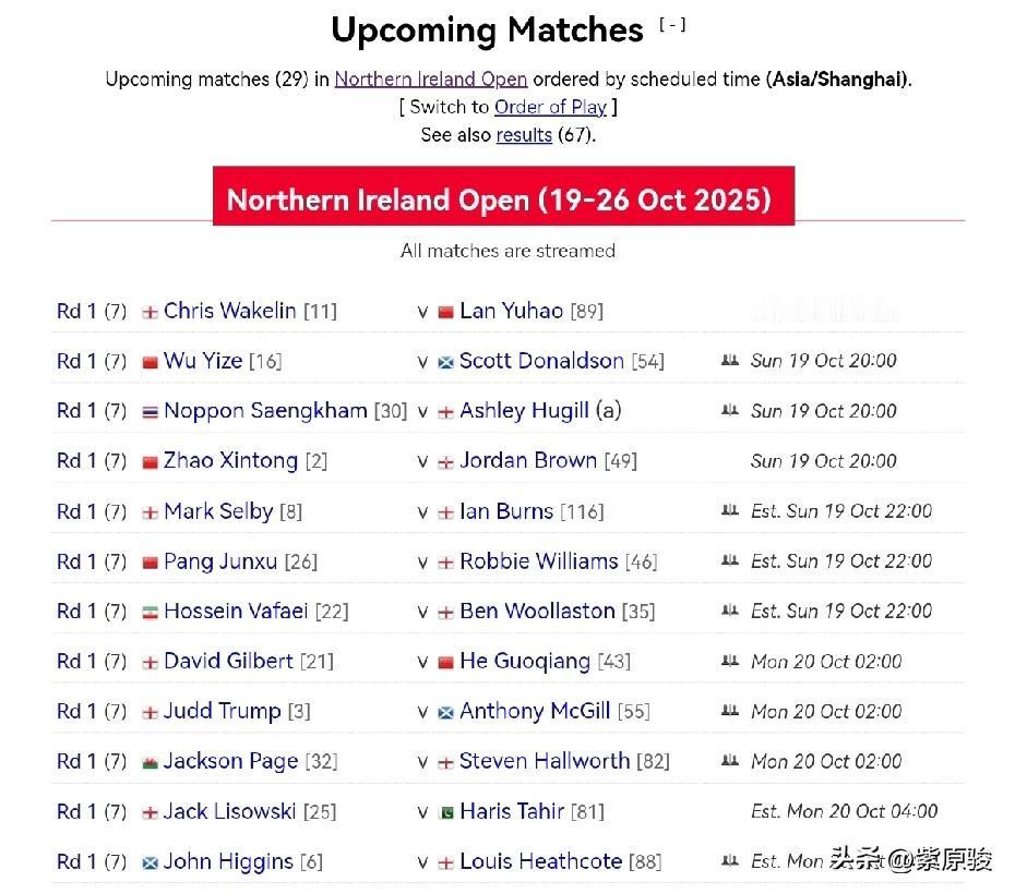 北爱尔兰公开赛正赛今天开打,今天有5名中国球员出战,最大看点还是赵心童的比赛。 今天中国球员的对阵如下: 17点: 蓝裕豪vs韦克林 20点: 赵心童vs乔丹·布朗 吴宜泽vs唐纳森 22点左右(接台): 庞俊旭vs罗比·威廉姆斯 明天凌晨2点: 贺国强vs大卫·吉尔伯特。 主要看点是赵心童的比赛,主要看他的状态如何、防守有没有提升。从对手看,乔丹·布朗实力一般,赵心童若正常发挥,应该可以拿下。 另外,龙泽煌因为第一轮对手马克·威廉姆斯退赛,直接晋级第二轮。