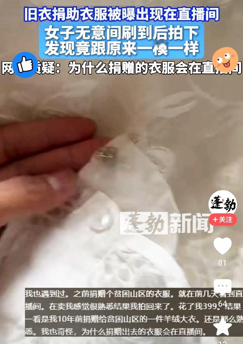 太离谱了! 一女子刷直播间,居然瞅见件羊绒大衣眼熟得不行,那是她十年前捐给贫困山区的! 就因为衣服上有颗自己补的、和别的扣子都不一样的扣子,她越看越确定,干脆花399块又买了回来。 拿到手一核对,果然是自己那件,衣服质量还挺好,可这事儿想起来就窝火。 这哪是捐赠,分明是有人把大家的爱心当成了生意本钱。本应送到困难人手里的温暖,反倒被某些人截胡倒卖,赚这种钱良心真的过得去吗? 这已经不只是寒心,更是违反慈善法的事儿 。 最可怕的是,这可能不是个例,好多人都在直播间见过自己捐的衣服。 要是爱心总被这么糟蹋,谁还敢真心做公益? 你们说,该怎么才能让咱们捐的东西真能到需要的人手里?