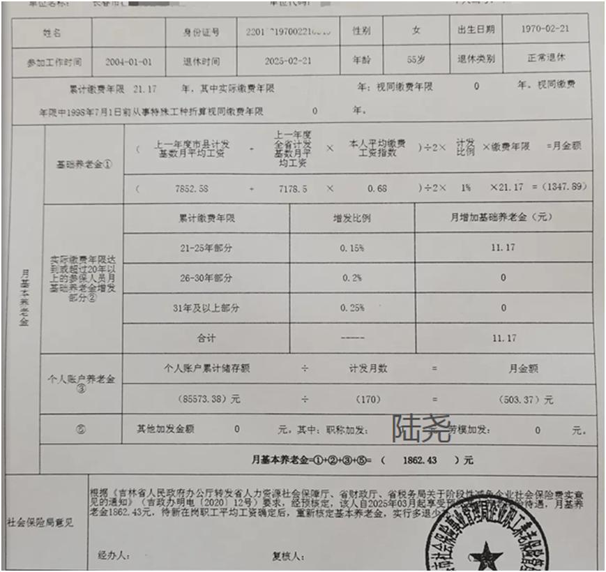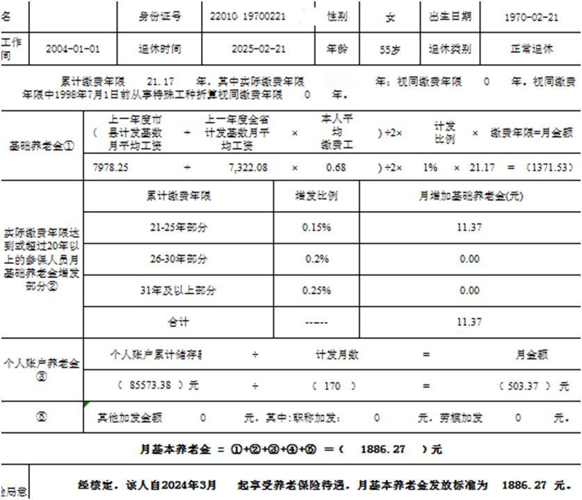 根据个人缴费基数计算平均缴费工资指数,综合参保因素计算退休养老金 近日,时常有朋友询问平均缴费工资指数怎么计算?下面以吉林长春的灵活就业女工为例,将平均缴费工资指数和养老金的计算过程介绍给朋友参考。 吉林省长春市灵活就业女工2025年2月55岁退休。 1970年2月出生,2004年1月开始缴费社保。 实际缴费21.17年(2004年1月至2025年2月)。 退休时个人账户累计存储额85573.38元。 2024年吉林省计发基数7178.5元,长春市计发基数7852.58元。 2025年吉林省计发基数7322.08元,2025年长春市计发基数7978.25元 一、吉林省本人平均缴费工资指数计算 计算平均缴费工资指数涉及个人的历年缴费,即:参保人员缴纳基本养老保险费至规定退休年龄为止的社保缴费基数。 参保人员本人平均缴费工资指数是指从开始缴费年度起至退休上一年度本人历年缴费工资指数的平均值。 参保人员当年缴费工资指数为本人当年缴费工资额与当年全省职工平均工资的比值。 本人平均缴费工资指数=各年缴费指数合除以缴费年度合计 本人平均缴费工资指数=(al/Al+a2/A2+……+an/An)÷N 公式中,al、a2……an为参保人员退休前1年、2年……n年本人缴费工资额; Al,A2……An为参保人员退休前1年、2年……n年全省职工平均工资; N为企业和职工实际缴纳基本养老保险费的年限。 (一)首先计算各年的平均缴费指数 2004年指数=600÷1035.92=0.58 每一年都需要按照这样的方法,依据当年的具体缴费工资额和全省职工平均工资来计算该年的缴费指数。 (二)计算本人平均缴费工资指数 再将各年的指数相加除以实际缴纳基本养老保险费的年限,计算得出本人平均缴费工资指数。 指数合=0.58+0.5+0.53+0.6+0.57+0.61+0.6+0.58+0.65+0.81+0.89+0.87+0.87+0.87+0.86+0.82+0.54+0.51+0.8+0.63+0.6=14.29 个人平均缴费工资指数=14.29÷21=0.68 二、预发月基本养老金 退休时,当年的计发基数还没有公布,暂按上年计发基数计算预发月基本养老金。 1、基础养老金 =(上一年度市县计发基数月平均工资+上一年度全省计发基数月平均工资×本人平均缴费工资指数)÷2×计发比例×缴费年限 基础养老金=(7852.58+7178.5×0.68)÷2×1%×21.17=1347.89元 2、月基础养老金增发部分 累计缴费年限第21~25年增发比例0.15%。 养老金增发部分=(7852.58+7178.5×0.68)÷2×(0.15%×1.17)=11.17元 3、个人账户养老金 =个人账户累计储存额÷计发月数(55岁退休计发月数为170) 个人账户养老金=85573.38÷170=503.37元 预发月基本养老金=1347.89元+11.17元+503.37元=1862.43元 三、按当年计发基数调整养老金 退休后,9月份吉林公布了2025年计发基数,按当年的计发基数对退休养老金进行调整。 基础养老金(调整)=[(7978.25-7852.58)+(7322.08-7178.5)×0.68]÷2×1%×21.17=23.64元 养老金增发部分(调整)=[(7978.25-7852.58)+(7322.08-7178.5)×0.68]÷2×(0.15%×1.17)=0.20元 月基本养老金(调整)=23.64+0.20=23.84元 四、核定退休养老金 基础养老金=1347.89元+23.64元=1371.53元 养老金增发部分=11.17元+0.20元=11.37元 个人账户养老金=85573.38÷170=503.37元 核定的月基本养老金=1371.53+11.37+503.37=1886.27元 工作21.17年,核定后的养老金1886.27元,折合每年89.1元。 以上是吉林省灵活就业人员养老金的计算过程,仅供朋友计算退休养老金参考。如需核定退休养老金,请去当地的社保部门进行咨询。 祝朋友,安康快乐!