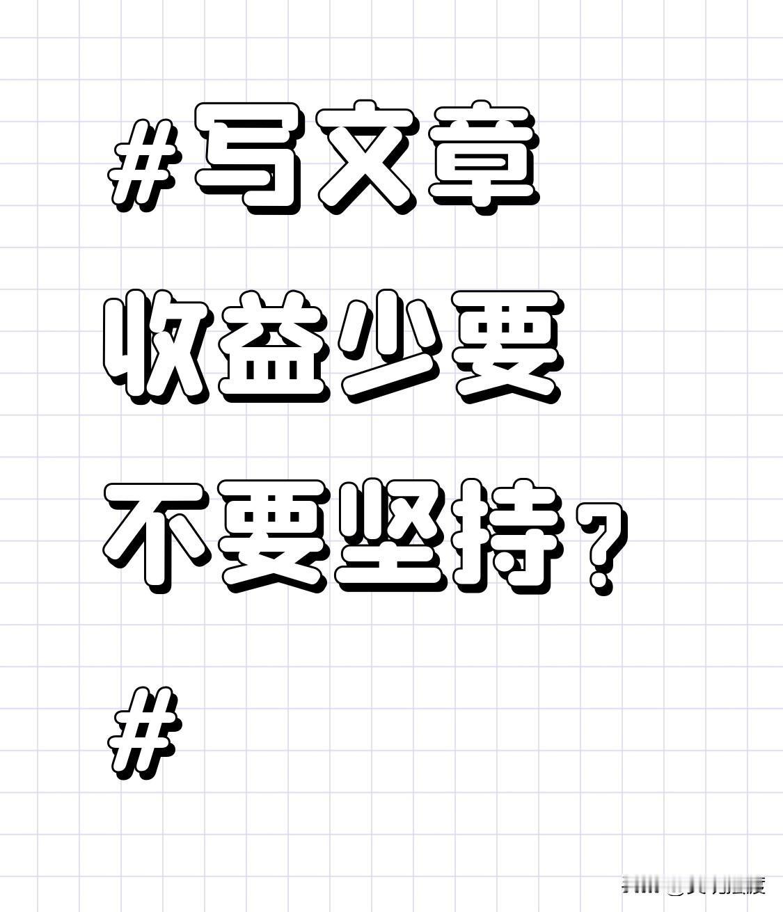 写文章收益少,还真挺让人纠结要不要坚持。就像故事里的柏波和布鲁诺,布鲁诺挑水立马有报酬,能及时享受;柏波却花两年挖管道,前期收益为零,但管道挖好后就有持续收入。写文章也类似,一开始收益少很正常,可一旦坚持,写作能力提升了,说不定哪天“管道”就通了,收入自然就来了。 不过,要是一直没收益,坚持的动力也会慢慢消磨,毕竟创作也是劳动,没正反馈就像对真空喊话。但如果写文章是为了自我表达,不在意平台算法和流量,那即便收益少,也值得坚持,因为这是在保留自己思考的纹理。 主要就是自己的兴趣爱好收益多或少无关[祈祷][祈祷]