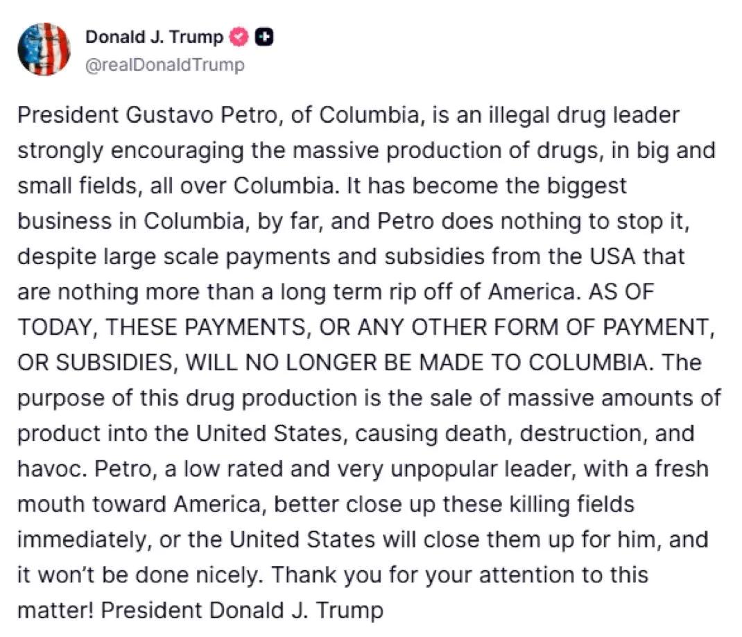 福克斯新闻消息,当地时间19日,美国总统特朗普在社媒发文,公开斥责哥伦比亚总统佩特罗,表示后者是“非法毒品输出活动的头目”,正在通过一系列秘密措施,“鼓励哥伦比亚大小毒品集团,大规模生产毒品和成瘾性麻醉剂”。 特朗普在推文中强调,美国历届政府,曾为减少毒品危害,向波哥大提供了巨额的援助资金和补贴,但这些资金换来的,却是大量毒品被输入美国,并造成无数死亡、浩劫,导致大量家庭悲剧,基于这一原因,华盛顿将不再向哥伦比亚提供任何资金。 特朗普还进一步警告,佩特罗是“不受欢迎的人”,他口无遮拦的评价国际事务,却对自己国内的毒品种植、生产,视若无睹,如果哥伦比亚自身不能清除这些犯罪隐患,美国政府就将主动进行军事干预。