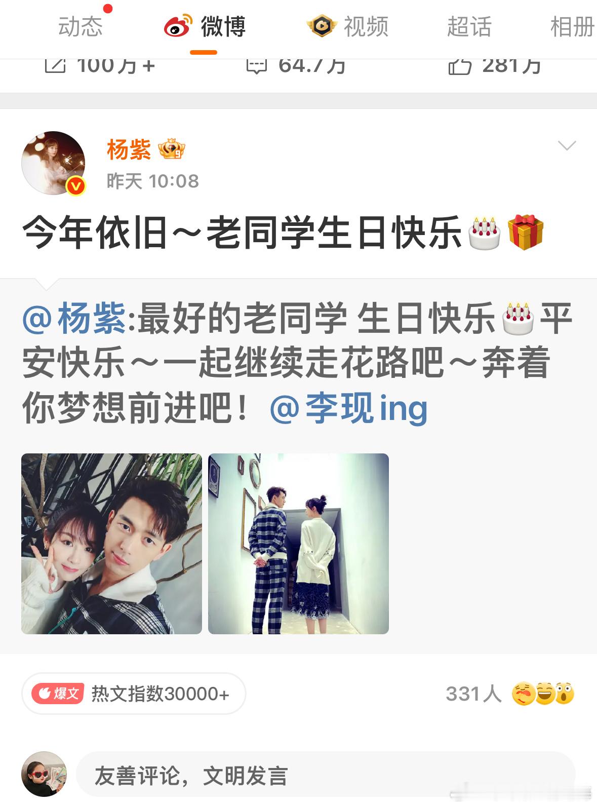 10月19日,杨紫202510191019踩点转评19年为李现的庆生图文祝李现生日快乐!杨紫直言今年依旧:“老同学生日快乐!”