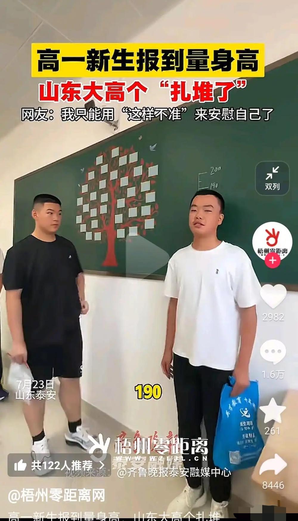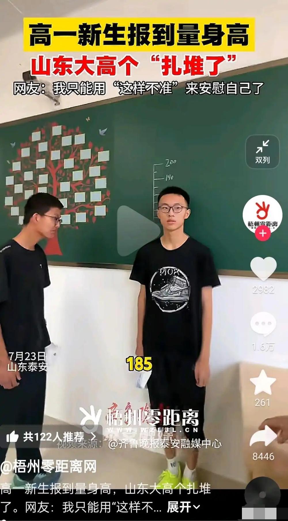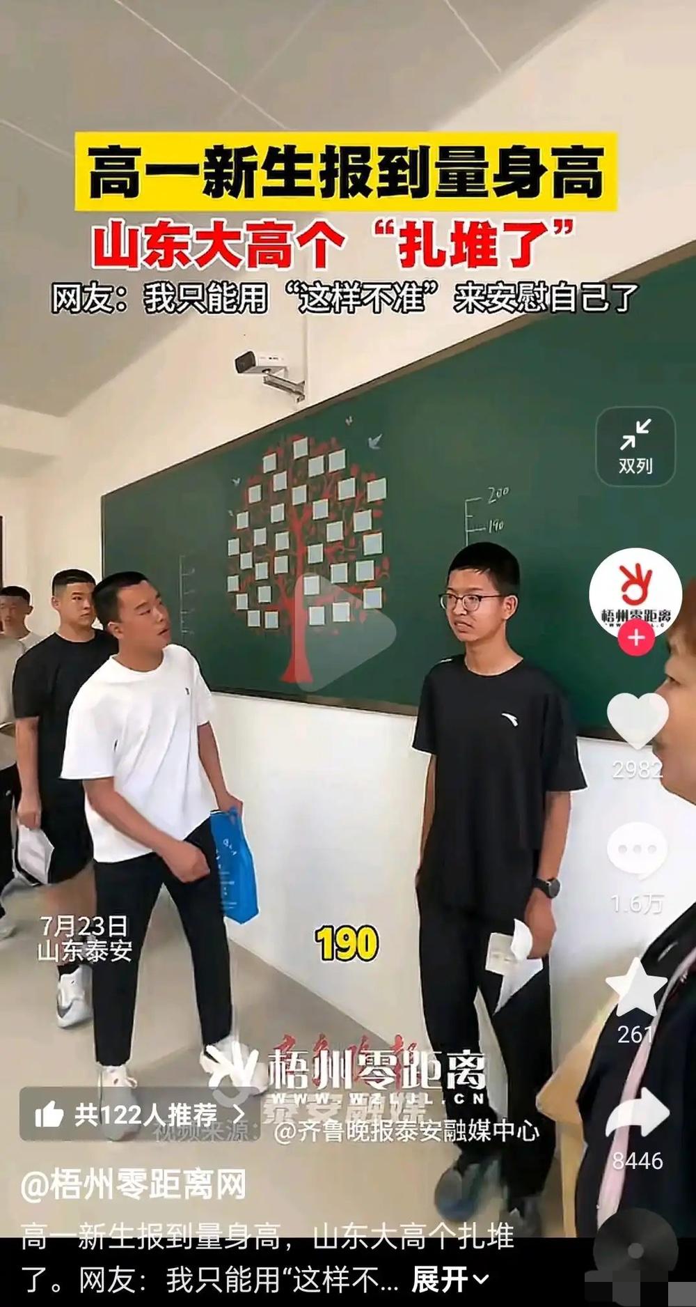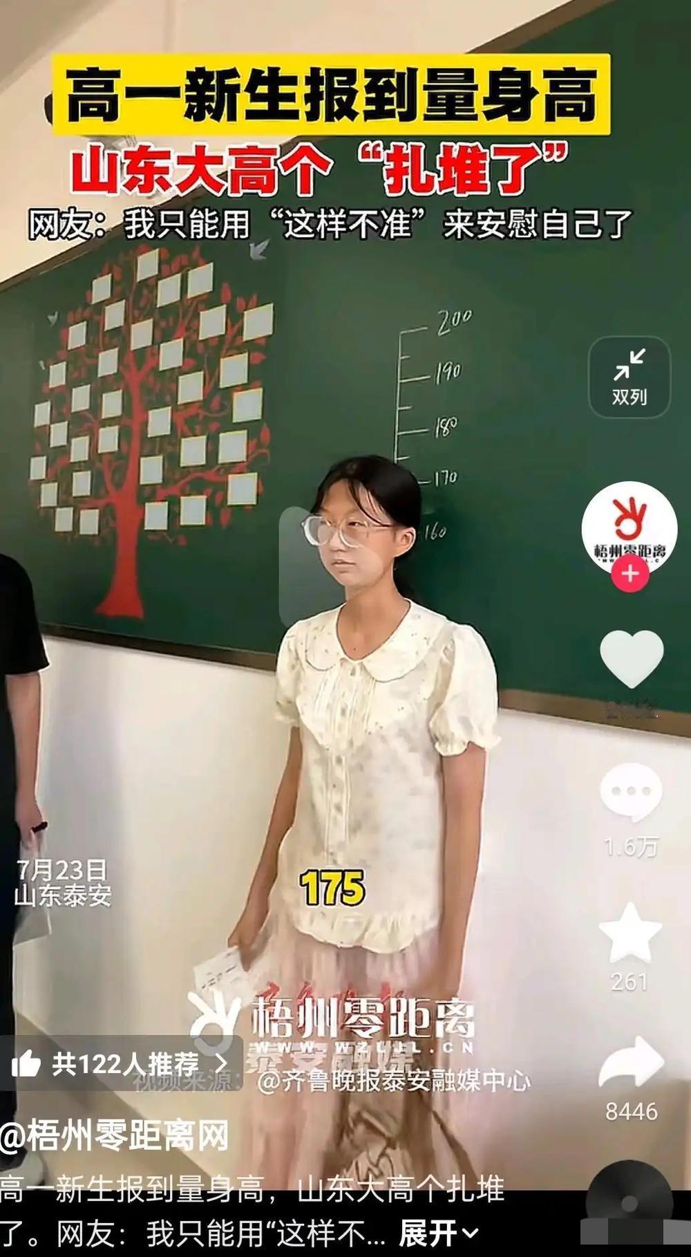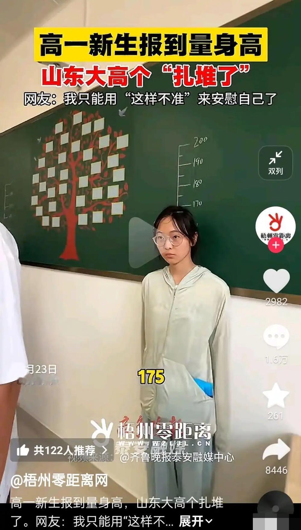 我就想问,山东量身高的尺子是不一样么,大家看那个穿鞋175的女生,肩膀才过黑板下