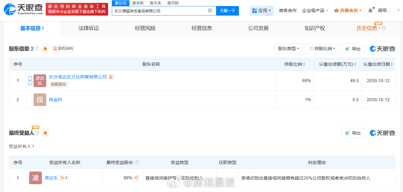 【#鹿哈再成立食品公司##鹿哈新公司叫馋猫突击#】10月20日,记者从天眼查获悉,近日,长沙馋猫突击食品有限公司成立,法定代表人为段金科,注册资本50万人民币,经营范围包括食品销售、食品互联网销售、初级农产品收购、日用百货销售等。股东信息显示,该公司由长沙凌达乐文化传媒有限公司、段金科共同持股。最终受益人信息显示,凌达乐(鹿哈)为该公司实际控制人。值得注意的是,今年8月,凌达乐(鹿哈)名下的湖南凌达乐食品有限公司刚注销。