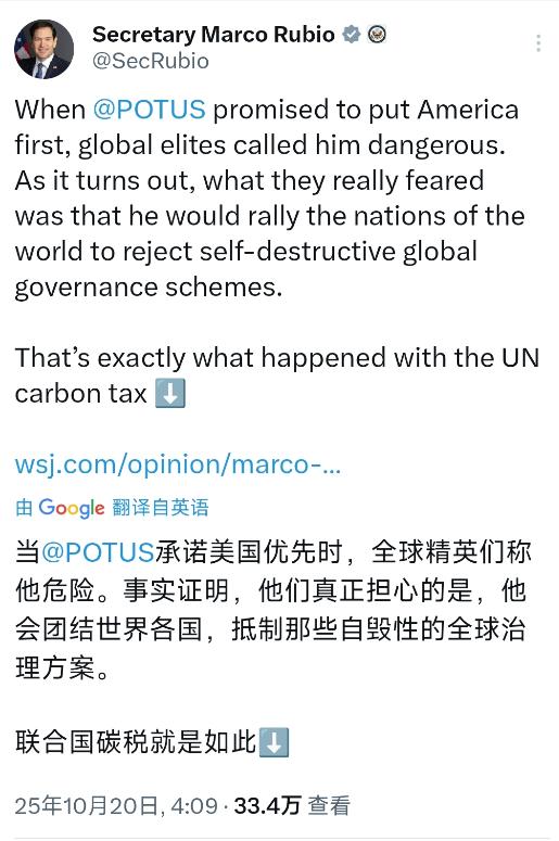 美国国务卿鲁比奥今天(北京时间10月20日)发文写道:“当特朗普总统承诺美国优先时,全球精英们称他危险。事实证明,他们真正担心的是,他会团结世界各国,抵制那些自毁性的全球治理方案。联合国碳税就是如此。”   鲁比奥这话纯属偷换概念,经不起半点事实推敲。特朗普所谓的“美国优先”从来不是什么团结世界,而是把单边主义当招牌,把全球合作当累赘,这点早被历史钉在了明面上。   回头看看2017年,特朗普刚上台就宣布退出巴黎协定,理由是“对美国不公平”。要知道巴黎协定是近200个国家熬了无数个日夜才达成的共识,目标是把全球温升控制在2℃以内,这是全人类对抗气候危机的共同防线。   美国作为全球第二大碳排放国,却一把扯断这根防线,转头还削减美国环保署31%的预算,放松汽车燃油效率标准,允许石油公司在阿拉斯加北极保护区钻探——这些操作哪里是“抵制自毁性方案”?明明是自己在气候治理上自毁长城。   更可笑的是鲁比奥提的“联合国碳税”,压根就是个不存在的东西。   联合国从来没推出过所谓的“碳税”,国际上跟碳相关的机制,比如欧盟的碳边境调节机制(CBAM),是为了避免高碳商品跨境流动导致的“碳泄漏”,2026年才正式实施,而且覆盖的只是钢铁、水泥这些高耗能行业,跟“联合国碳税”八竿子打不着。   美国自己国内连联邦层面的碳税都搞不起来,特朗普时期更是把“碳税”当成洪水猛兽,现在鲁比奥拿个虚构的概念来煽风点火,无非是想给特朗普的单边主义贴层“正义”的标签。   全球精英当年担心特朗普“危险”,怕的不是他“团结世界”,而是他这套“美国优先”会拆了多边合作的台。就说气候治理,没有哪个国家能独善其身。   2023年全球平均气温比工业化前高了1.15℃,极端天气接连炸锅:巴基斯坦洪水淹了三分之一国土,欧洲热浪烤焦了莱茵河,美国自己的得州寒潮冻停了电网。   这些灾难面前,需要的是各国攥紧拳头一起扛,而特朗普却在把拳头挥向盟友——他当年威胁要对进口汽车加税,逼得欧盟不得不启动贸易报复,连日本、韩国这些盟友都被架在火上烤。这种“团结”,谁愿意凑这个热闹?   再说鲁比奥口中“自毁性的全球治理方案”,恰恰是美国自己在搞“自毁操作”。特朗普退出巴黎协定后,全球减排进程没停,中国承诺2030年前碳达峰、2060年前碳中和,欧盟要在2035年停售燃油车,连印度都把可再生能源装机目标提了又提。   反观美国,直到2021年拜登才重新加入巴黎协定,但特朗普留下的烂摊子哪那么好收拾?2022年美国碳排放同比还涨了1.3%,煤炭消费逆势增加7.5%。现在鲁比奥倒打一耙,说别人的治理方案“自毁”,这脸皮厚度也是没谁了。   更讽刺的是,特朗普所谓的“团结世界”,实际是“孤立自己”。他任内退出的国际组织和协议两只手数不过来:退出伊核协议、联合国教科文组织、全球移民协议……连世卫组织都曾被他“开除”,要不是疫情失控,恐怕现在还没回来。这种“退群成瘾”的做派,让美国在全球的信誉一落千丈。   就拿气候合作来说,美国退出巴黎协定那几年,全球气候资金缺口扩大了40%,发展中国家想买新能源设备都找不到足够的融资——这哪里是“抵制自毁”?分明是给全球治理添堵。   鲁比奥现在翻出这些陈词滥调,无非是想给特朗普的政治遗产脸上贴金。但事实就摆在那儿:“美国优先”从来不是什么救世良方,而是把美国利益凌驾于全球利益之上的霸权逻辑。   联合国碳税是假的,特朗普破坏全球合作是真的;全球精英担心的不是“团结”,而是美国单边主义拆台;气候危机面前,只有多边合作才是活路,搞“退群”“甩锅”那套才是真的自毁。   现在全球都在加速向绿色转型,中国的新能源汽车出口量占了全球60%,欧盟的风电光伏装机每年增长20%,就连东南亚国家都在抢着建光伏电站。   而鲁比奥还在拿虚构的“联合国碳税”说事儿,试图把美国的气候治理失职包装成“反抗不公”,这种说辞骗骗自己人还行,放到国际上根本没人搭理。   毕竟大家都清楚,对抗气候危机靠的是携手并肩,不是“美国优先”的孤家寡人——谁在真干事,谁在瞎忽悠,全球眼睛都亮着呢。