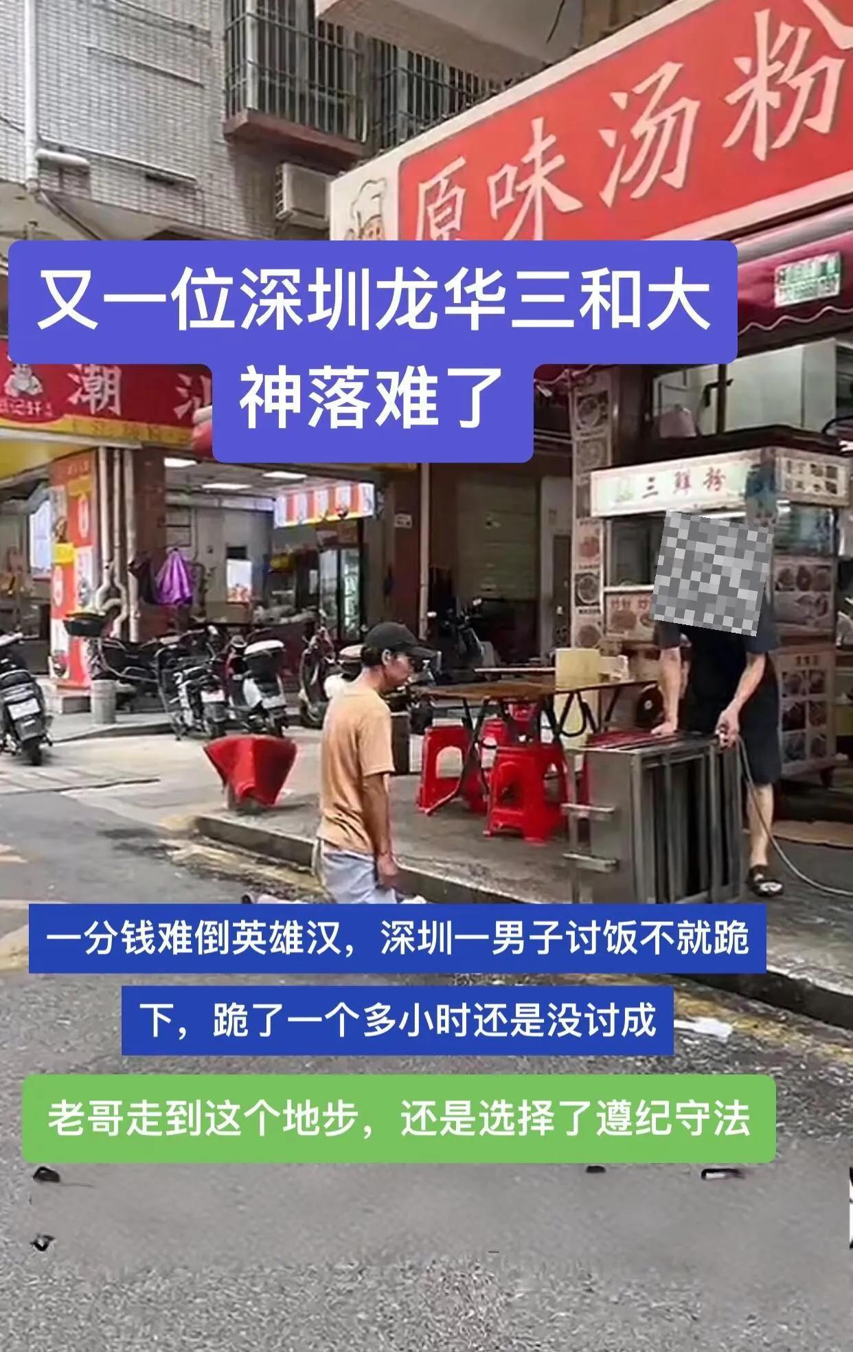 深圳龙华一街头,男子路过肠粉店,告诉老板他三天没吃饭了,希望老板能请他吃份肠粉,遭到老板拒绝后,竟然给肠粉店老板脆下了,脆了一个多小时,老板并没有为之动容,而是恶语相向,路过的行人也议论纷纷。 网友评论: 前天在停车场遇到一个人说两天没吃饭了,让我跟他买碗面条吃,我说可以,然后快到面馆的时候,他说能不给点钱,我说没有,我说你要是肚子饿了,我可以帮你买点吃的,要钱真没有。他就不干了,嘴里嘟嘟囔囔的,没理他,走了。 男儿膝下是黄金,既然人家都跪下了,这老板还不能赏一份肠粉,太吝啬了! 建议食客们别人这家店吃了! 最起码的社会责任与基本的同情心都没有! 这老板心太硬了,也就几块钱,至于让一个落魄的人跪一个多小时吗?门前跪着人,谁愿意进去吃饭,这老板也是个老铁。 这老板心肠太硬了,随手施舍没什么难度,我要是在场会请那个下跪的吃一顿———很多年前遇到过一家三口类似处境,请那一家吃了炒牛河,然后指点对方去派出所求助,钱可不能随便给,因为确实很难分清真假,但是表面的饥饿潦倒还是看得出来的,所以请吃不给钱。