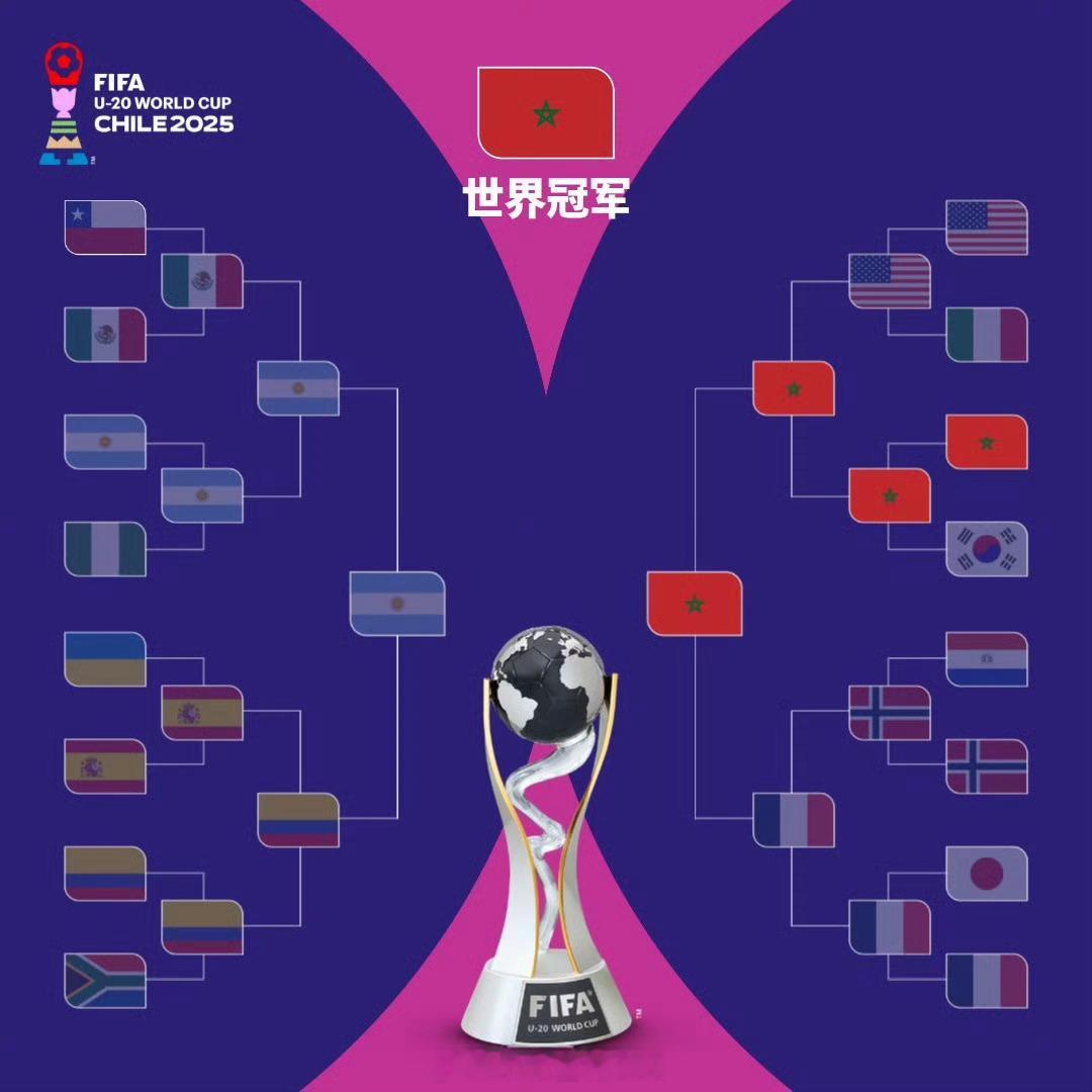 2025年世青赛决赛,摩洛哥U20队2-0战胜阿根廷U20队,首次夺得世青赛冠军!