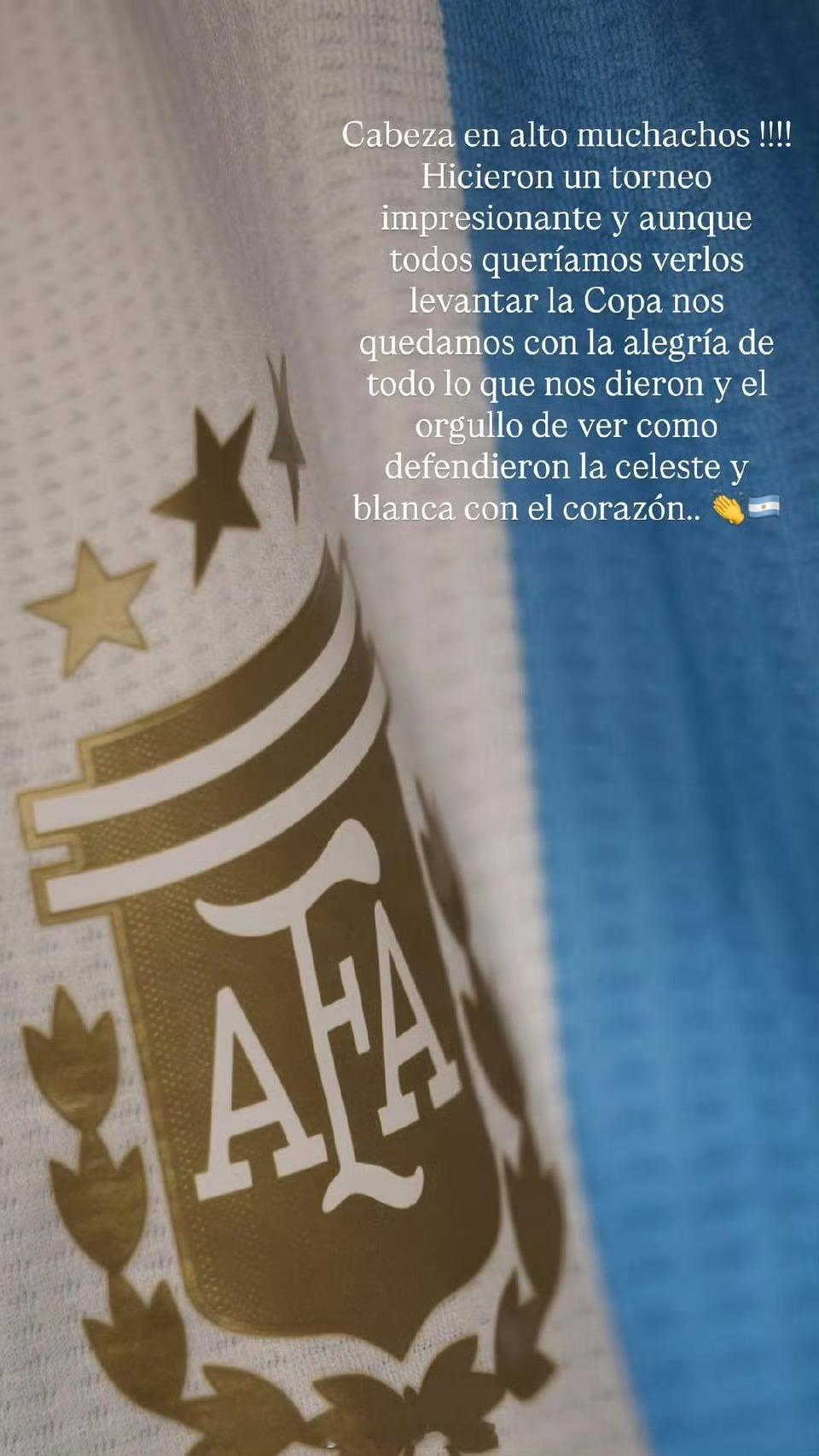 梅西更新社媒鼓励阿根廷U20队球员们:“抬起头来,孩子们!你们踢出了一届精彩的赛事。虽然我们都希望看到你们捧起冠军奖杯,但你们在场上所付出的一切、用心捍卫蓝白之色的样子,已经让我们充满喜悦与自豪。”