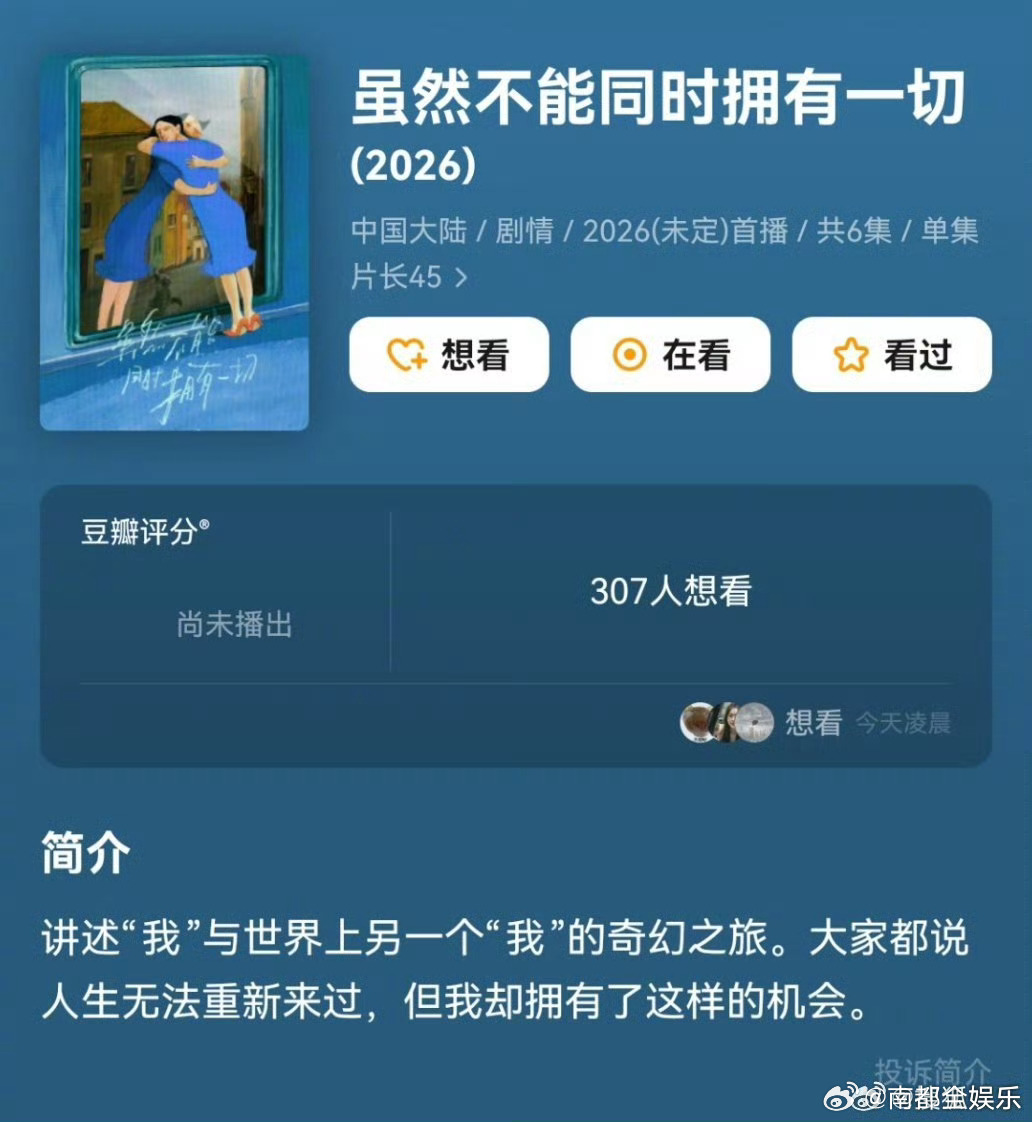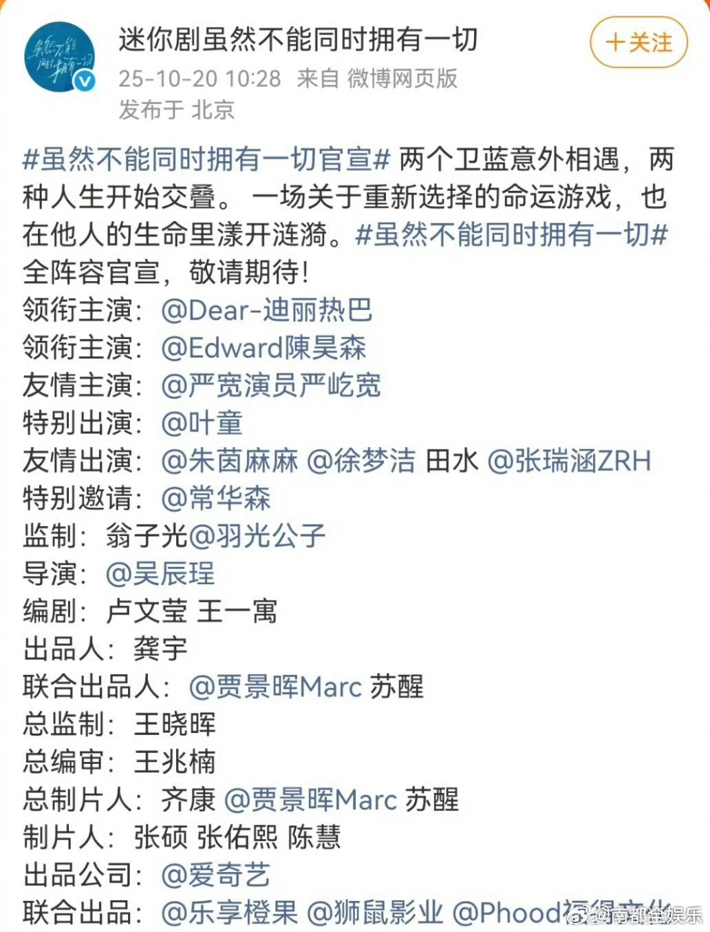 迪丽热巴蓝裙背影今日,迪丽热巴主演的《虽然不能同时拥有一切》发布蓝裙背影海报官宣。粉丝评:“好消息:迪丽热巴拍双女主剧了。更好的消息:双女主都是迪丽热巴演的!”两个卫蓝究竟会发生什么故事?期待热巴美美上线[哇]! ​迪丽热巴大女主排面 ​​​