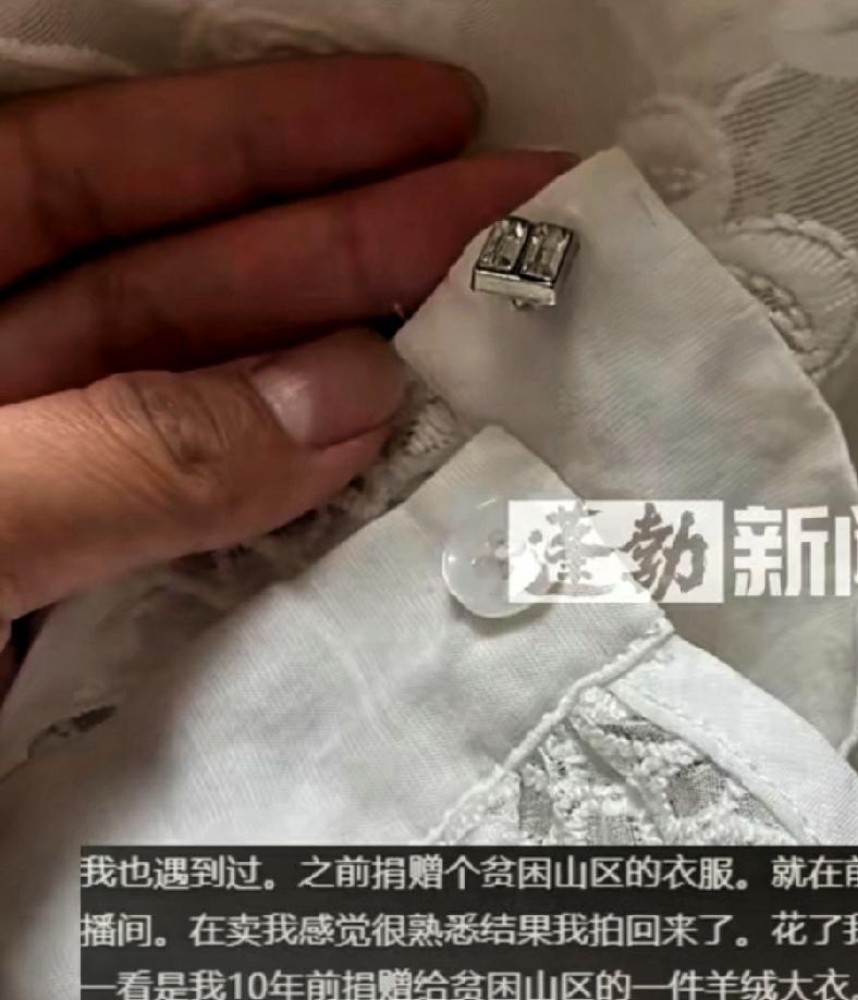 真的令人难以置信! 一女子在直播间看到一件羊绒大衣,看着眼熟,可这件衣服十年前就捐了,怎么会在直播间?但是衣服上的一个扣子太熟悉了,因为当时衣服上掉了一个,她就另外找了一个亲手缝上,为了验证真假她花了399买下这件羊绒大衣,果不其然真是她十年前捐走的那件衣服,因为她亲手缝的那个不一样的扣子太扎眼了。核对后,果然是自己的旧物。 这哪是捐赠,分明是给人送了“货源”。 最寒心的不是衣服被卖,是善心被明码标价。 我们捐的是温暖,他们赚的是黑心钱,这中间的监管漏洞才该好好补补。