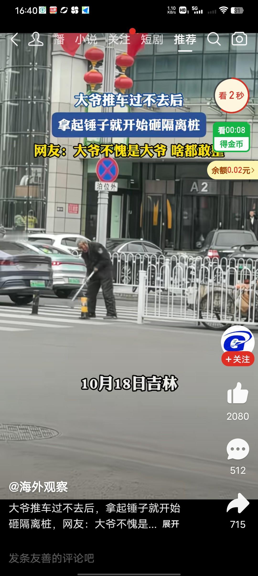 古有初生牛犊不怕虎,现有大爷不怕法律,大爷不愧是大爷,他干了百分之九九人不敢干的事! 大爷就因为推车过不去,一言不合就开干,用自带的的锤子清除路障。不得不说大爷就是大爷啊,他干了所有人想干都不敢干的事! 有人不嫌事大的说,这多好车子也能轻松的过去了,还能卖铁。也有人担心大爷,会不会有15日拘留,罚款2000呢?旁边的人解释说,不用担心超过七十岁拘留所不要不给养老。 这大爷一定是一员虎将啊!佩服佩服!