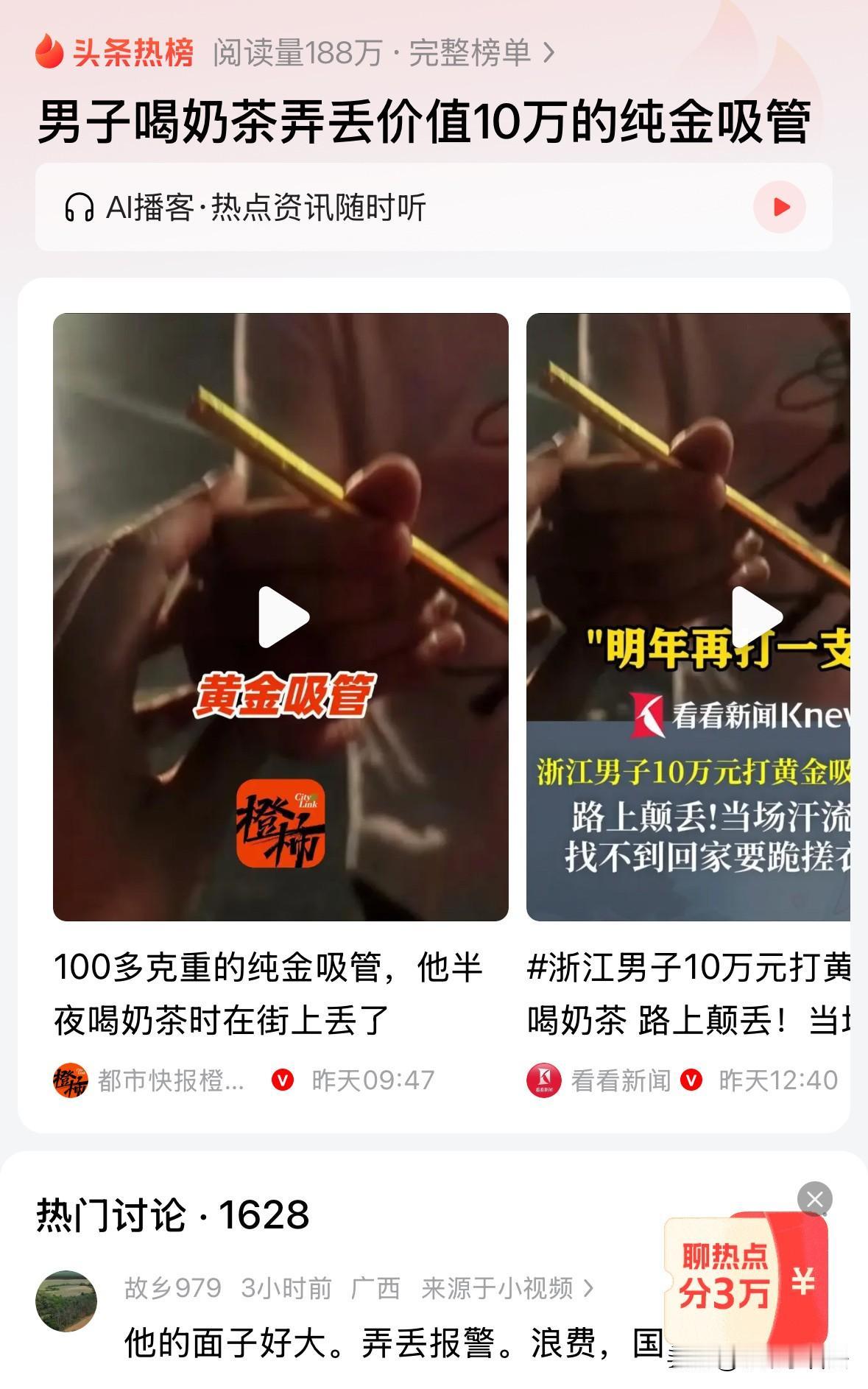 浙江诸暨,36岁男子跟朋友吃完宵夜后骑电动车回家,把100克重的纯金吸管放在车筐里,经过井盖时一颠,就听到哐当一声轻响,男子赶紧停车翻看车筐,黄金吸管果真掉落。男子寻找无果后报警,警方与其一起寻找几十分钟也没有找到,民警凭借工作经验大胆判断,果然成功找到吸管。网友:大街上捡到都不会相信是纯金的! 浙江的寿先生怎么都没想到,自己能够因为纯金吸管丢失火了一把,要说感谢,还真的要感谢民警同志丰富的工作经验。 在十多天前,寿先生和朋友约好吃宵夜,于是就习惯性的将夏天打造的纯金吸管带在身上。 寿先生喜欢喝奶茶,但是有时候店家没有吸管,于是寿先生就让朋友帮忙打造了一根纯金的吸管,方便随时使用。 吃完宵夜后,寿先生骑上电动车往家走,将吸管放在电动车的车兜里。 因着急回家,车速快了些,所以在经过一处井盖时,车子整个就颠了一下,然后寿先生就听到了哐当一声轻响。 寿先生很清楚那声轻响是吸管掉落的声音,于是赶紧停下来查看是不是吸管掉了出去,果不其然,吸管不见了。 寿先生折返回去,借着昏暗的路灯光线左搜右找,苦苦找了半个多小时,但是还是没有找到吸管。 这根吸管有100克金重,价值10万元,要是让寿先生的媳妇知道吸管丢了,肯定要跪搓衣板。 寿先生满头大汗的寻找未果后,赶紧打电话报警,希望警方能给予一定的帮助。 诸暨市公安局城东派出所有两名专职巡逻队员赶到现场,根据寿先生的描述,3个人一起寻找起来。 因当时灯光昏暗,很难看清楚地上的情况,就算拿着手电筒以井盖为中心展开地毯式搜索,也没有发现吸管的踪迹。 3个人寻找几十分钟后,还是未果。这时民警凭借工作经验想到一种可能,因吸管是圆柱体,很可能掉落后会借着惯性滚动。 寿先生觉得民警说得很有道理,就按照民警的想法往吸管可能滚动的方向寻去。 果然在不足百米的地方发现了反光的黄金吸管,民警将吸管捡起,原物奉还给寿先生。 寿先生连连道谢,要不是民警工作经验丰富,恐怕不可能这么快就寻找到吸管。 民警让寿先生把东西收好,这么贵重的物品,下次别再随便塞裤兜里了! 事后寿先生还专门给派出所送了一面锦旗,以表示自己的感激之情。 寿先生丢失吸管的事情被发布到网上后,很多媒体对寿先生进行了采访。 36岁的寿先生平时就很喜欢买黄金,买了将近十年,偶尔也会将买到手的黄金打造成自己喜欢的样式。 黄金吸管是寿先生方便使用让朋友帮忙锻造的,他还锻造过黄金奥特曼。 媒体对寿先生的采访新闻报道出去后,寿先生的媳妇看到了新闻,并没有让寿先生跪搓衣板,而是让寿先生低调一点。 黄金吸管掉落地面时摔的坑坑洼洼,已经无法继续使用,于是寿先生将吸管熔掉,打算明年再打造一根。 若不是民警们的耐心仔细的寻找,寿先生很可能就丢失掉了这根黄金吸管,但若是有人捡到后,却没有归还给寿先生的话,寿先生还可以报警或者提起民事诉讼。 根据《民法典》第314条的规定:拾得遗失物,应当返还权利人。拾得人应当及时通知权利人领取,或者送交公安等有关部门。 要是民警和寿先生都没有寻找到黄金吸管,就很有可能被其他人捡走。按照法律规定,捡到东西应该返还给失主,或者是上交给公安部门。 若是捡到黄金吸管的人没有上交,或者将其藏匿起来的话,寿先生可以对其提起诉讼,要求其归还拾到的黄金吸管。 拾到者拒不交出的话,很有可能会处以有期徒刑或者拘役,还会对其进行处罚。 根据《刑法》第270条的规定:将代为保管的他人财物非法占为己有,数额较大,拒不退还的,处二年以下有期徒刑、拘役或者罚金;数额巨大或者有其他严重情节的,处二年以上五年以下有期徒刑,并处罚金。 将他人的遗忘物或者埋藏物非法占为己有,数额较大,拒不交出的,依照前款的规定处罚。 根据《人民警察法》第21条的规定:人民警察遇到公民人身、财产安全受到侵犯或者处于其他危难情形,应当立即救助;对公民提出解决纠纷的要求,应当给予帮助;对公民的报警案件,应当及时查处。 无论寿先生丢失的是价值10万元的黄金吸管,还是丢失一件普通的东西,身为人民警察,都应对公民进行救助,予以帮助。 寿先生在丢失黄金吸管后,自己寻找未果报警求助,民警及时出警并对寿先生丢失的物品展开地毯式的搜索。 在搜索几十分钟后都没有结果,但是民警同志依然没有放弃,而是凭借着丰富的工作经验打破僵局,为寻找黄金吸管提出关键性判断,最终寻找到丢失的黄金吸管,并物归原主。 给为寿先生提供帮助的民警们点个赞,不愧为人民的守护者!