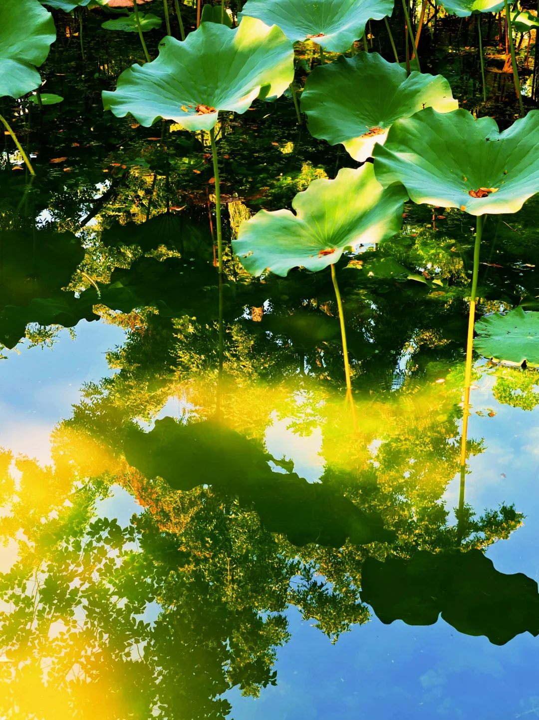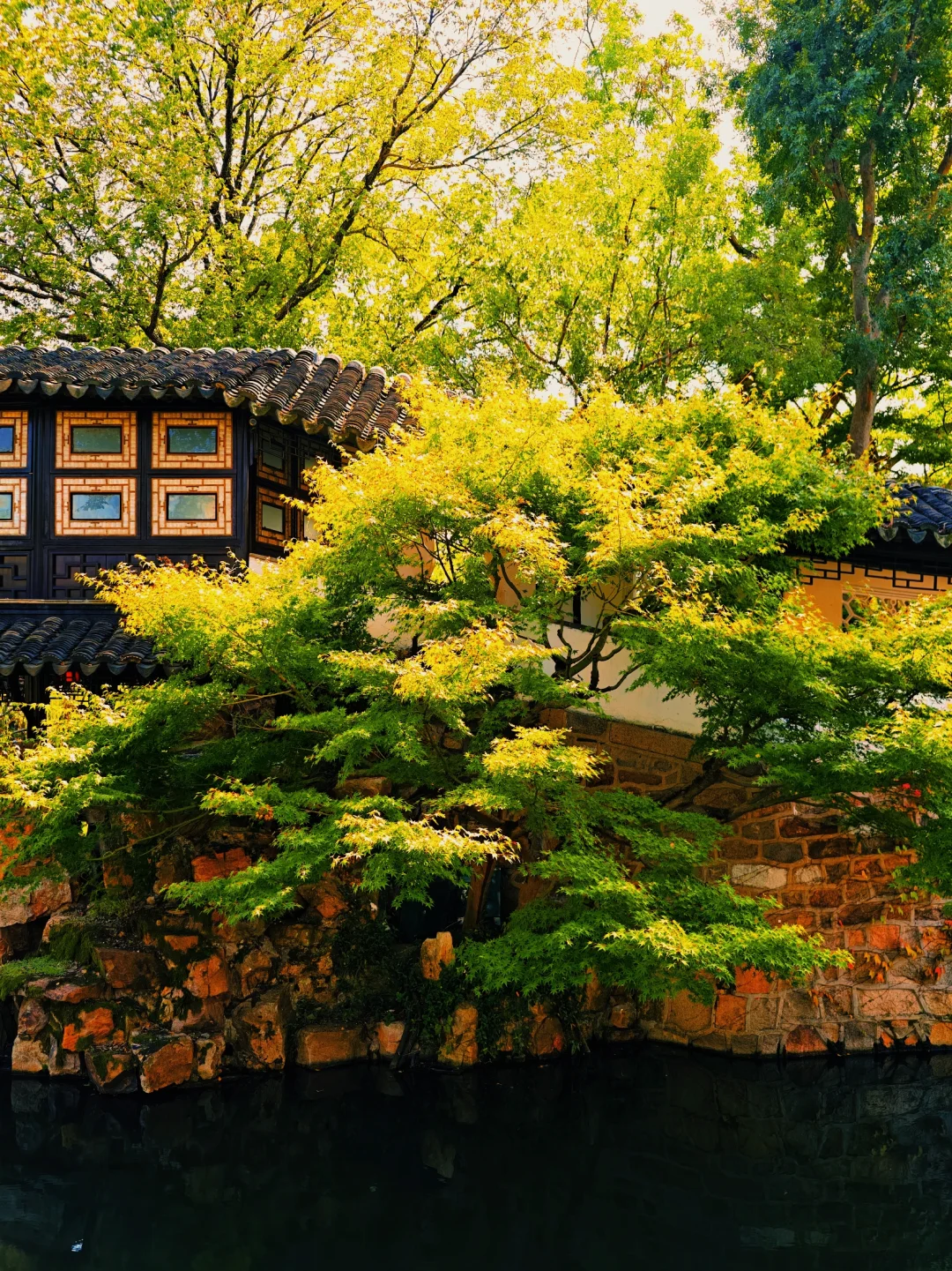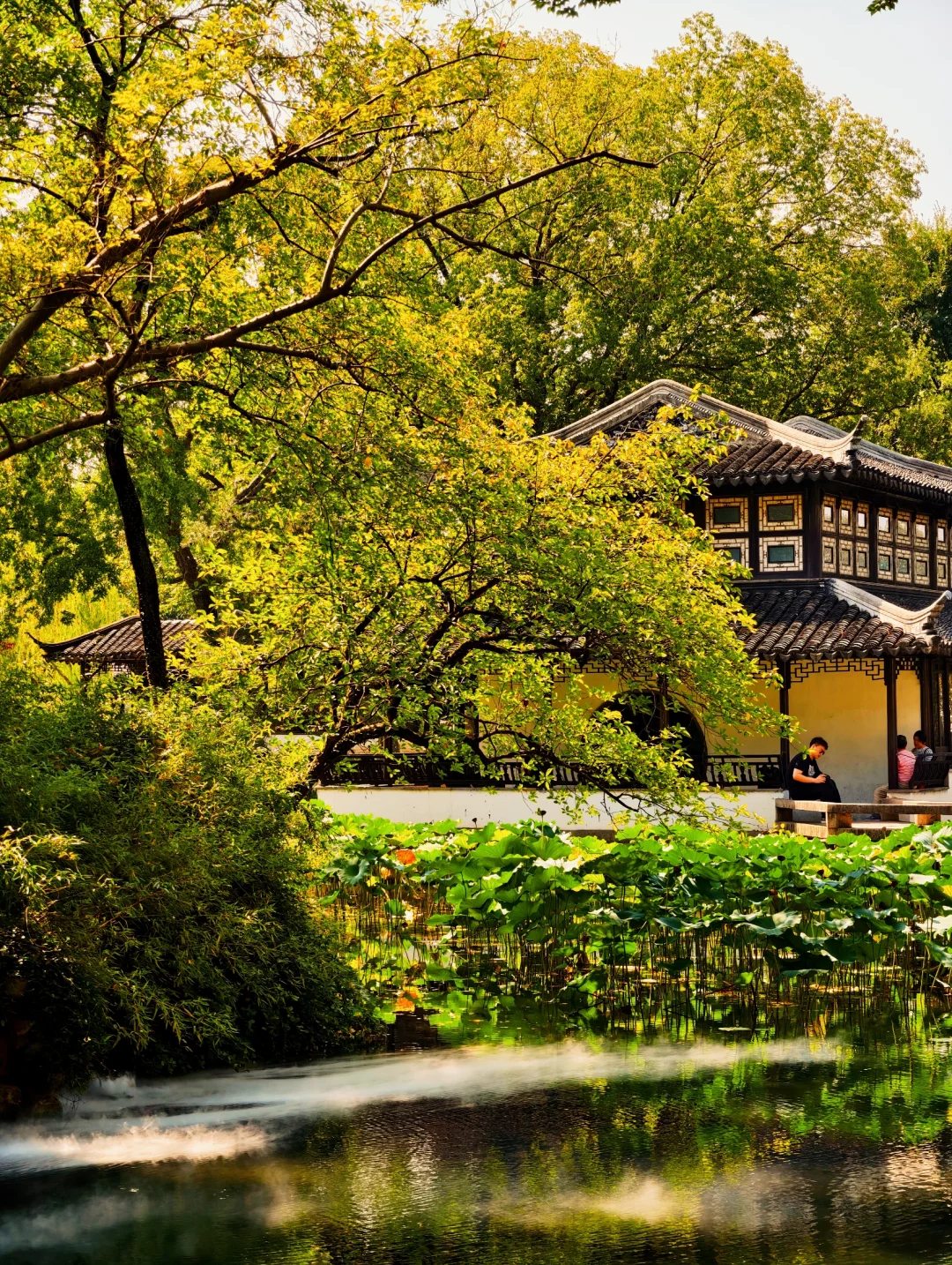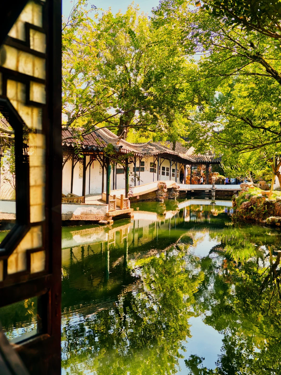 相信我,看过金光下的拙政园 你会明白什么叫“移步换景,步步入画” 这个时候的园子 才真正有了江南园林的魂! —— 你会看到: · 水面碎金闪烁,倒映着亭台楼阁 · 雕花木窗在斜阳下投下斑驳光影 · 连最普通的石板路都变成了金光大道 · 荷叶镶着金边,锦鲤在金光中游弋 -