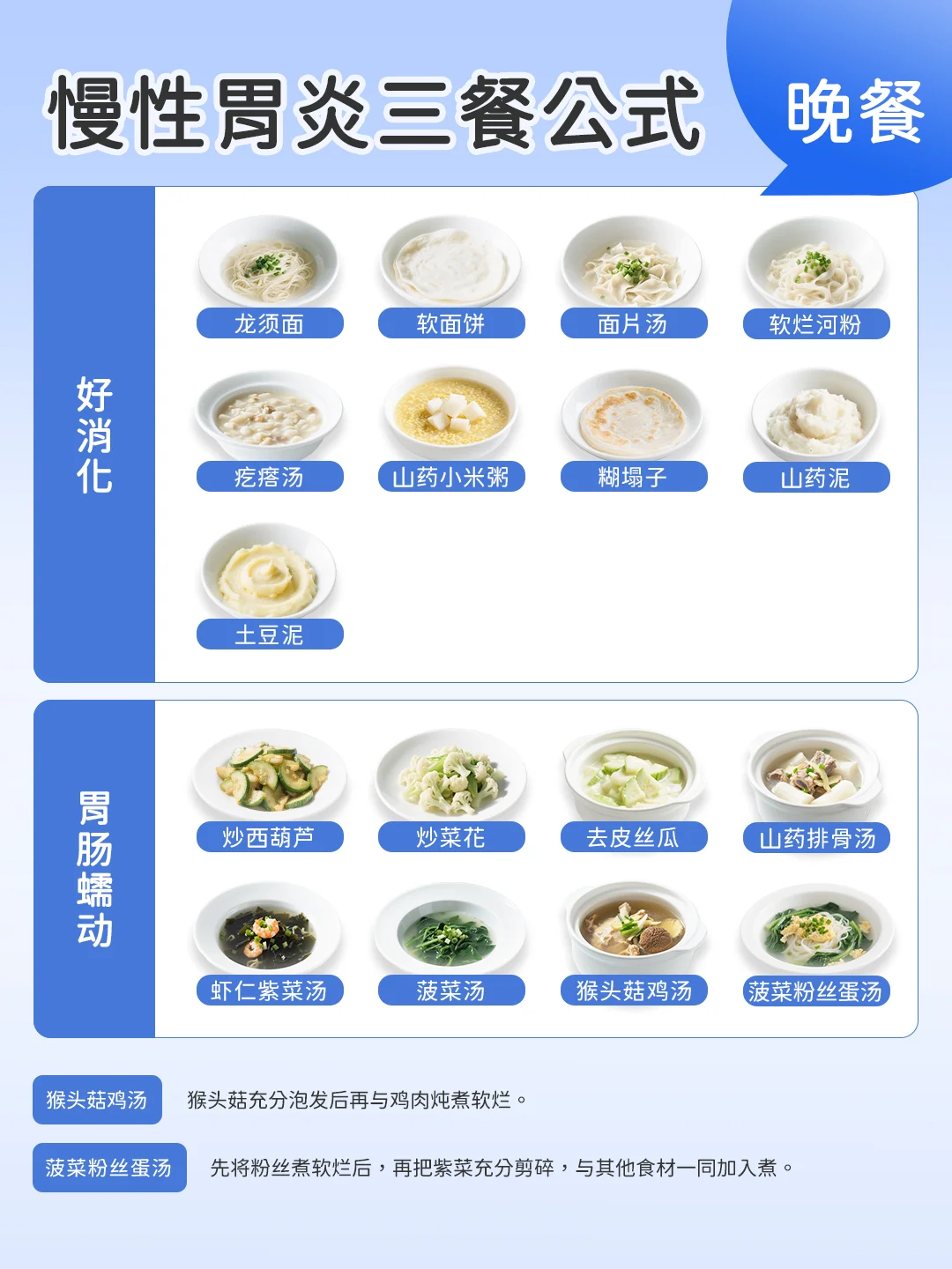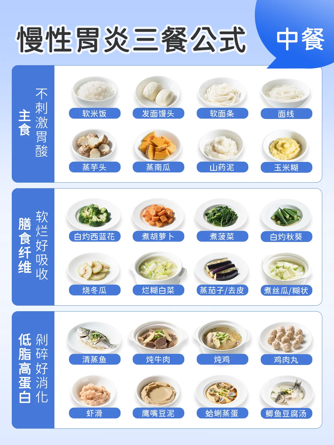 【早餐:中和胃酸+优质蛋白+黏膜保护因子】 优先选择弱碱性/中性食物,帮助中和夜间分泌的胃酸,避免空腹;搭配生物价高的优质蛋白,为胃黏膜修复提供原料;额外补充含胶质或黏液的成分,在胃壁形成保护膜,降低胃酸对受损黏膜的侵蚀。 【午餐:主食+可溶性纤维+低脂易消化蛋白】 主食选低gi类型,减缓胃排空速度,避免血糖骤升骤降引发的胃酸过量分泌;膳食纤维以可溶性为主,减少对胃黏膜的物理摩擦,同时利于肠道菌菌;蛋白质需控制脂肪含量,且选择结构松散、易被消化酶分解的种类,减轻胃肠消化负担。 【晚餐:短消化时长+温和促蠕动+低负担配比】 整体遵循「清淡、少量、易消化」原则,选择消化时长<3小时的食物组合;加入温和的促蠕动成分,帮助餐后胃内容物排空,避免食物滞留发酵;严格控制脂肪和粗纤维占比,防止夜间胃肠蠕动减慢时,加重胃胀、反酸。 慢性胃炎调理的关键是「营养适配」,这套公式既规避了刺Ji因素,又能满足身体基础营养需求,坚持1-2个周期,能明显感受到胃肠不适感减轻。