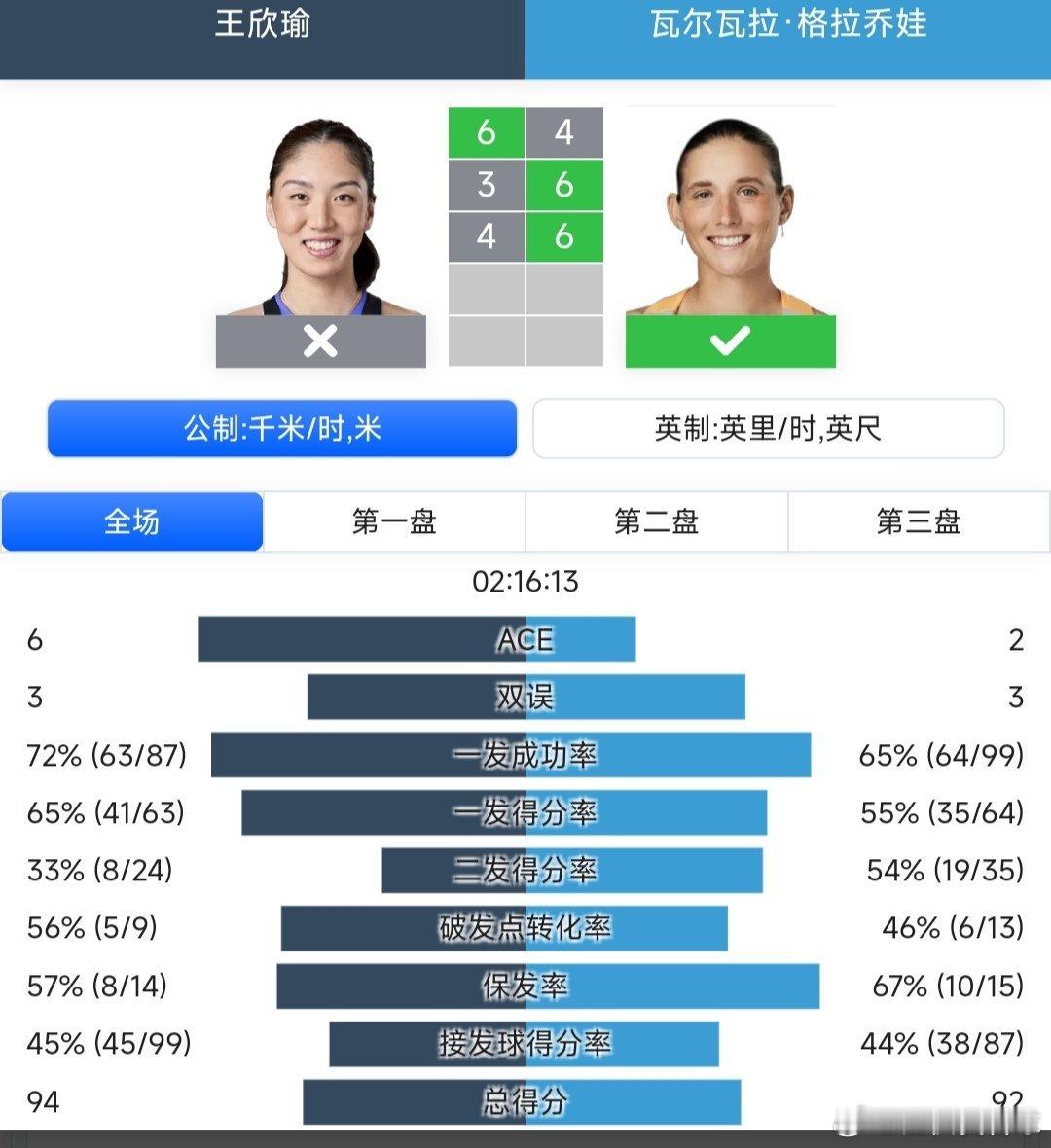 王欣瑜🇨🇳6-4/3-6/4-6不敌资格赛晋级的格拉乔娃🇫🇷,无缘晋级第二轮。王欣瑜单打遭遇5连败,希望能尽快调整状态,加油加油!