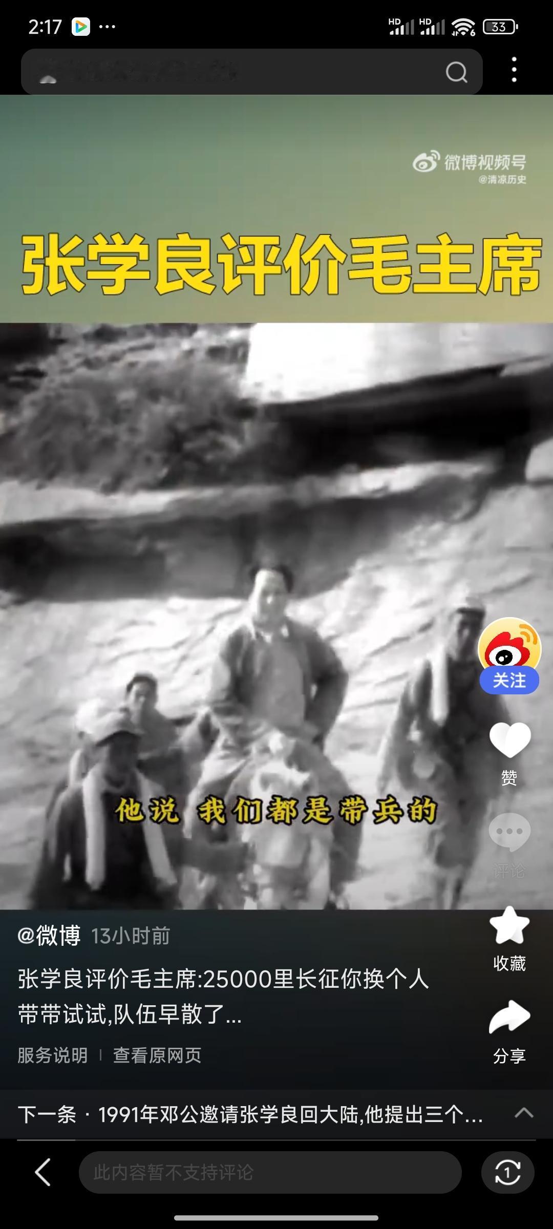 张学良评价毛主席? ——毛主席和蒋介石之比差距有多大? 1990年被软禁54年之久后释放的张学良出狱了。 出狱后有记者采访问他这一生最佩服的人是谁?他说出了三个人的名字,第一个是他父亲张作霖,第二个是周总理,第三个是毛泽东。说出前两个人们还没觉什么奇怪的,因为一个是他开疆拓土的父亲,再一个是他过去交往甚密相熟相知的人,第三个是毛泽东就让人觉得有些不可思议了,因为张学良和毛主席从未谋面、从未交往、从未像毛泽东和鲁迅一样从心底里相互欣赏不说,还相去这么多年还能惦记着毛泽东做人做事的伟大? 真的不可思议了。 过后琢磨琢磨,一个年已九旬的老人,人生积淀思考半个多世纪的话语不可谓不沉重不可谓没有道理。 之后他还谈到毛主席带兵能长征25000里的往事,他说:毛泽东带领红军完成25000里长征那可别说,换个人试试?带一千里都带不了,队伍可能早散了。 由于有人采访和年纪大表达简略的缘故,他把当时的背景没说那么详细,详细说是那时毛主席带领的红军吃没吃的穿没穿的,还要跟着队伍急行军,还要每天面对死亡,还不知道未来在哪里?真的还不如一个流浪汉,流浪汉还有自由还能规避风险趋利避害,这呢啥没啥?我凭啥非跟你走?非跟你面对可能无吃的饿死、爬雪山冻死、过草地溺死、打仗打死的巨大风险? 可既是这样除了战斗减员和行军路上恶劣条件下减员的都到达了陕北延安,几乎没人当逃兵。 可是反观像蒋介石带兵,就会好无来由的抓壮丁,那管你愿意不愿意?没给过百姓一个说法一点安慰就当街掳走,比土匪还土匪,土匪还只要钱,不拆家,这个不仅拆家还可能让人丢命。 没給手下发饷的毛泽东有人玩命的愿意跟随, 而抓壮丁的蒋介石他除了給军官开高薪的办法他一天都玩不转。 这就是毛泽东和蒋介石之间的又一个巨大差距。
