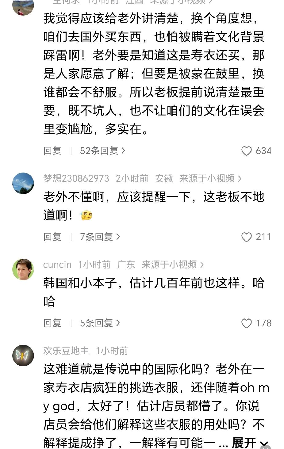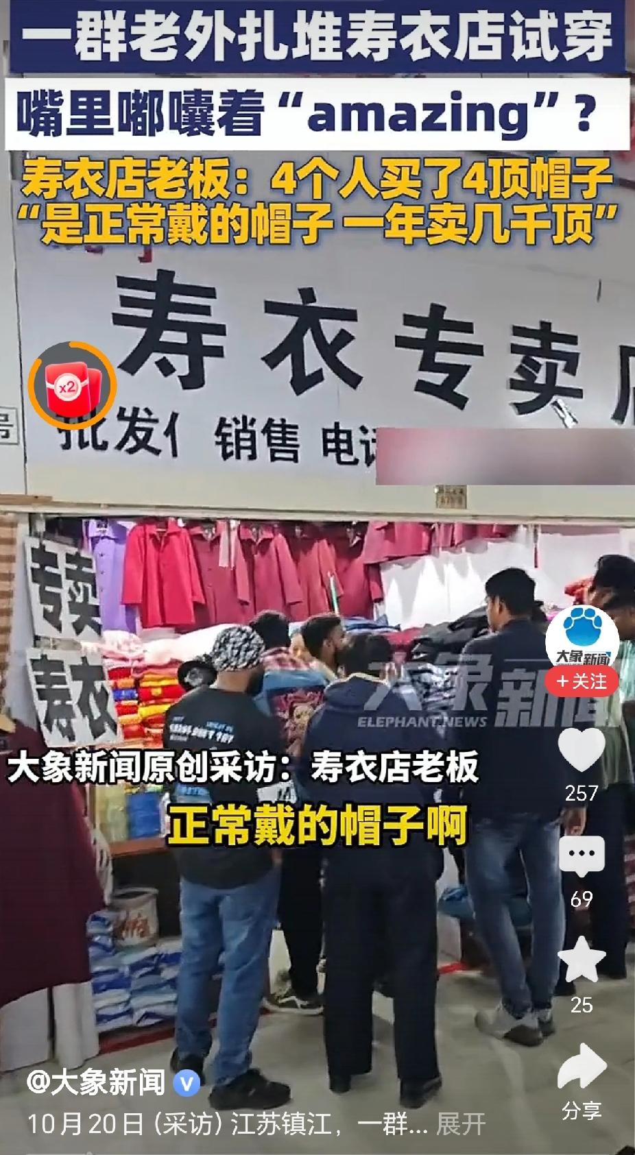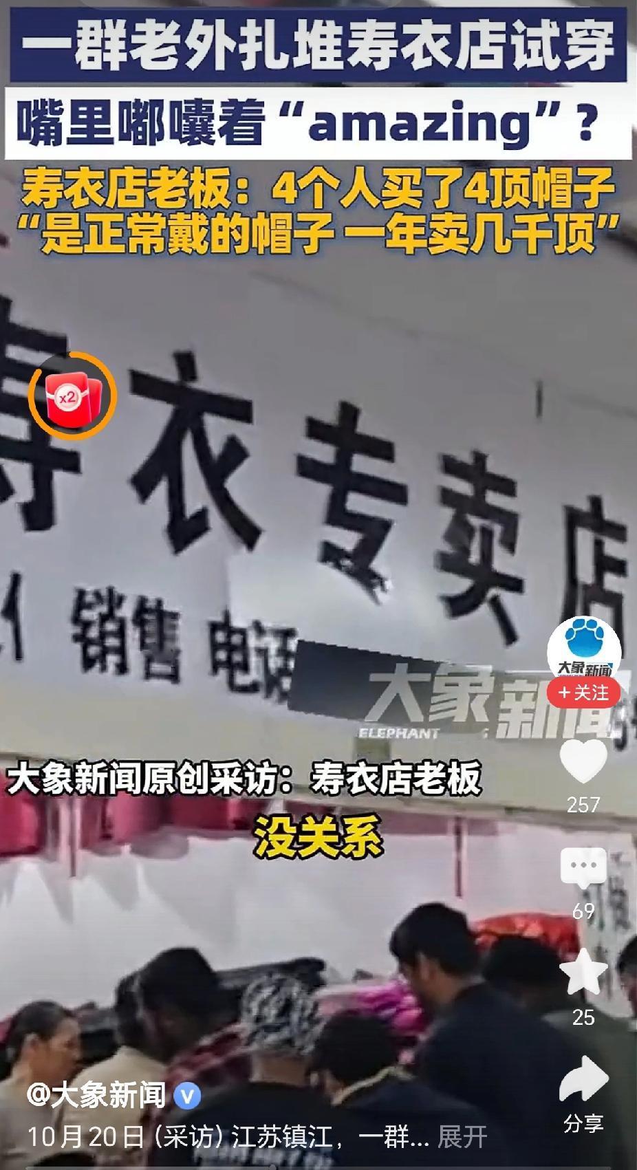 “懵圈了,一群老外扎堆在寿衣店买衣服!”近日,江苏镇江,一家寿衣专卖店迎来了一群特殊的顾客,他们说着oh my god,四个人买了四顶帽子!(来源:@大象新闻 ) 据视频报道,10月20日,位于镇江的一家寿衣专卖店,几个外国人来到店里,对这家店的衣服帽子非常感兴趣。 他们一边挑选着一边询问价格,并且进行试穿,嘴里说着这件好,那件也不错,看起来兴高采烈的。 “最终,四个老外选了四顶帽子,一人一顶!”老板说,“这是正常戴的帽子啊,没有关系的,我一年卖了几千顶!” 从视频看,这家店除了卖寿衣,确实也卖正常的衣服,可能价格便宜,作为批发肯定也是有销路的。 “我觉得还是应该给老外讲清楚,这个文化的差异!”有网友说,如果老外知道了这是寿衣还买,这说明他们想了解我们的文化,这个生意就应该是没关系的。 “老外不懂啊,应该提醒一下。这个老板不地道啊!”有网友认为老板不地道,故意坑这些老外。 在一些批发市场,确实有一些店它既卖寿衣,也卖正常穿的衣服,虽然写着寿衣专卖店,但也不影响其正常穿的衣服,这样可以多一种生意的渠道! 寿衣一般有专门的式样和尺寸,与正常的衣服还是明眼就能够看出来的,只是在一个店里,确实应该区分清楚,别让顾客踩坑! 对此你的看法呢?老外寿衣店里扎堆试穿 寿衣可以自购面料定制吗? @秋实99 关注人生冷暖,拥抱幸福生活!