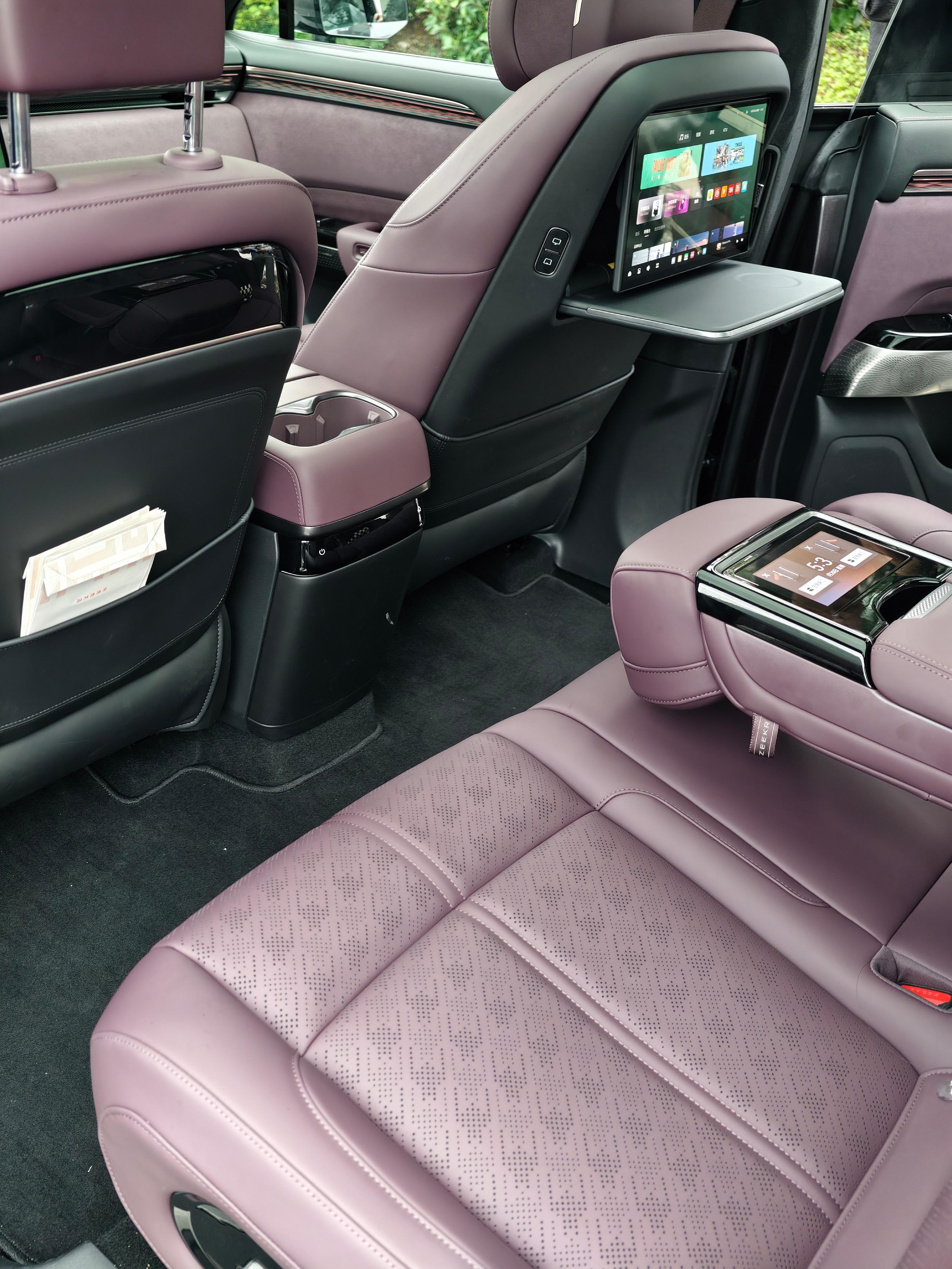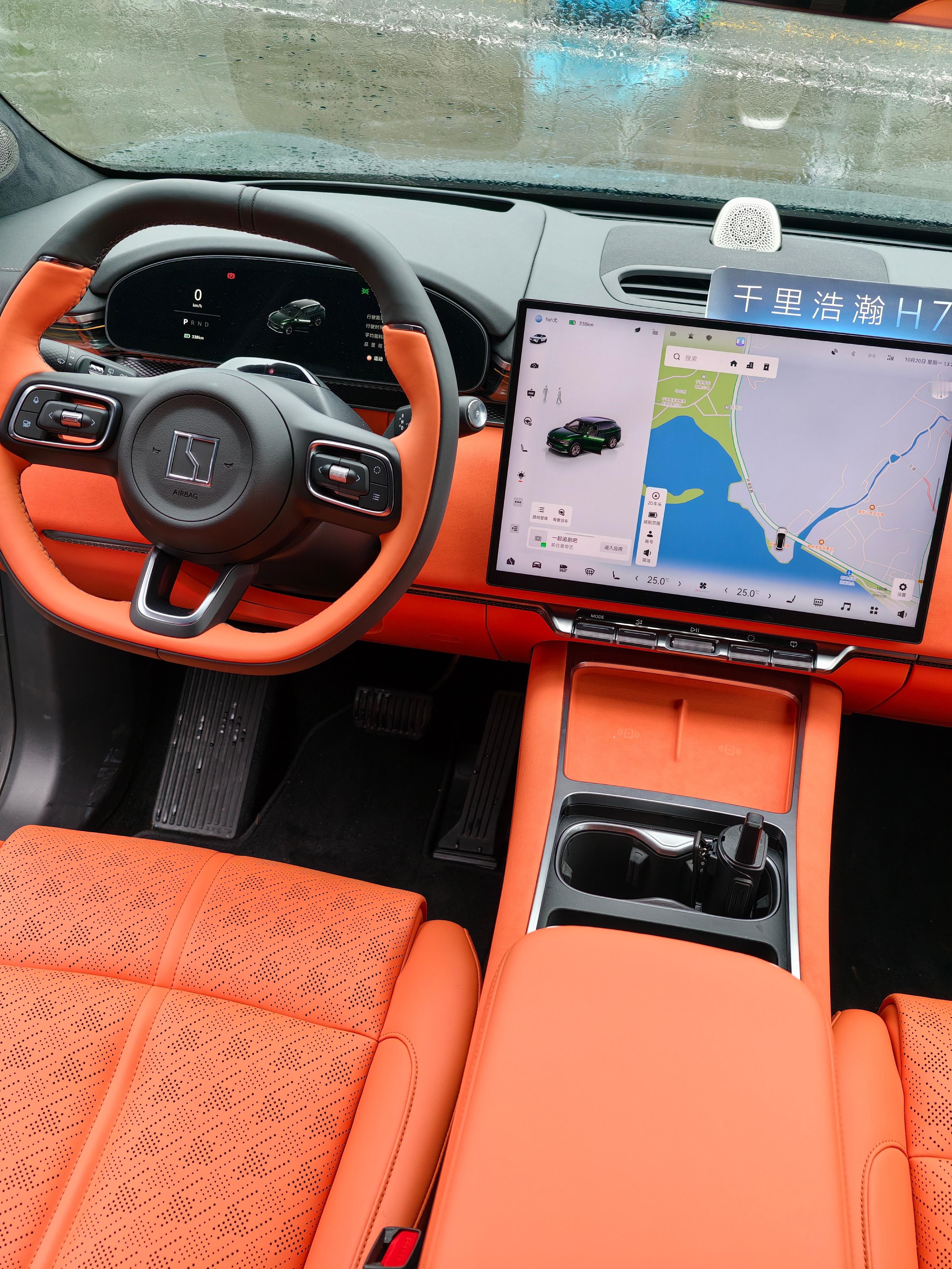 内饰新增黑橙和黑紫配色,顶棚用了麂皮绒材质,质感更好,新增冰箱和两个杯架,更加实用。