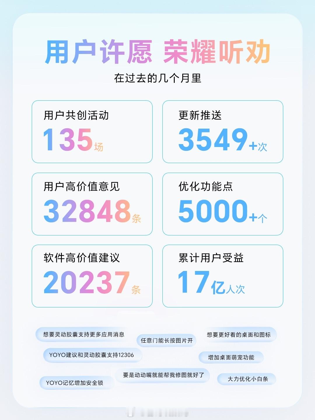在过去的几个月中,荣耀通过积极响应用户建议、坚持与用户共创改进、坚持月月有更新,通过上千次更新推送和功能优化,让上亿人次从中受益!