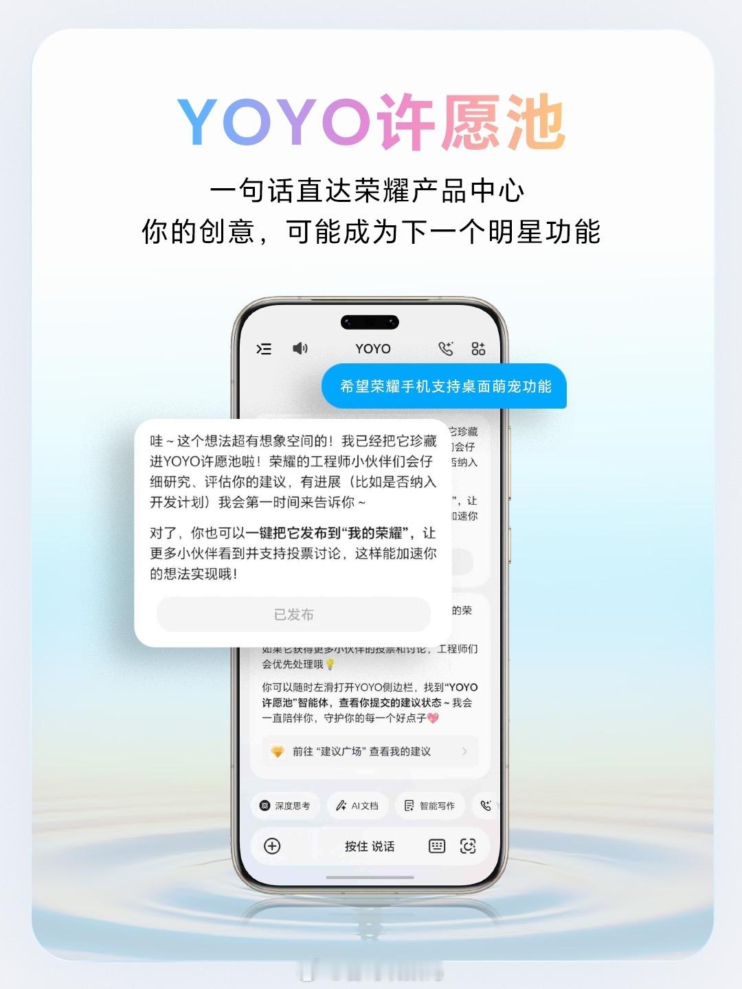 接下来,荣耀将继续坚持听劝改进、共创升级、月月有更新、AI持续进化。并发布YOYO许愿池计划,大家对荣耀产品的任何想法,建议或不满,都可以直接给YOYO说,YOYO会帮你直通荣耀产品中心。