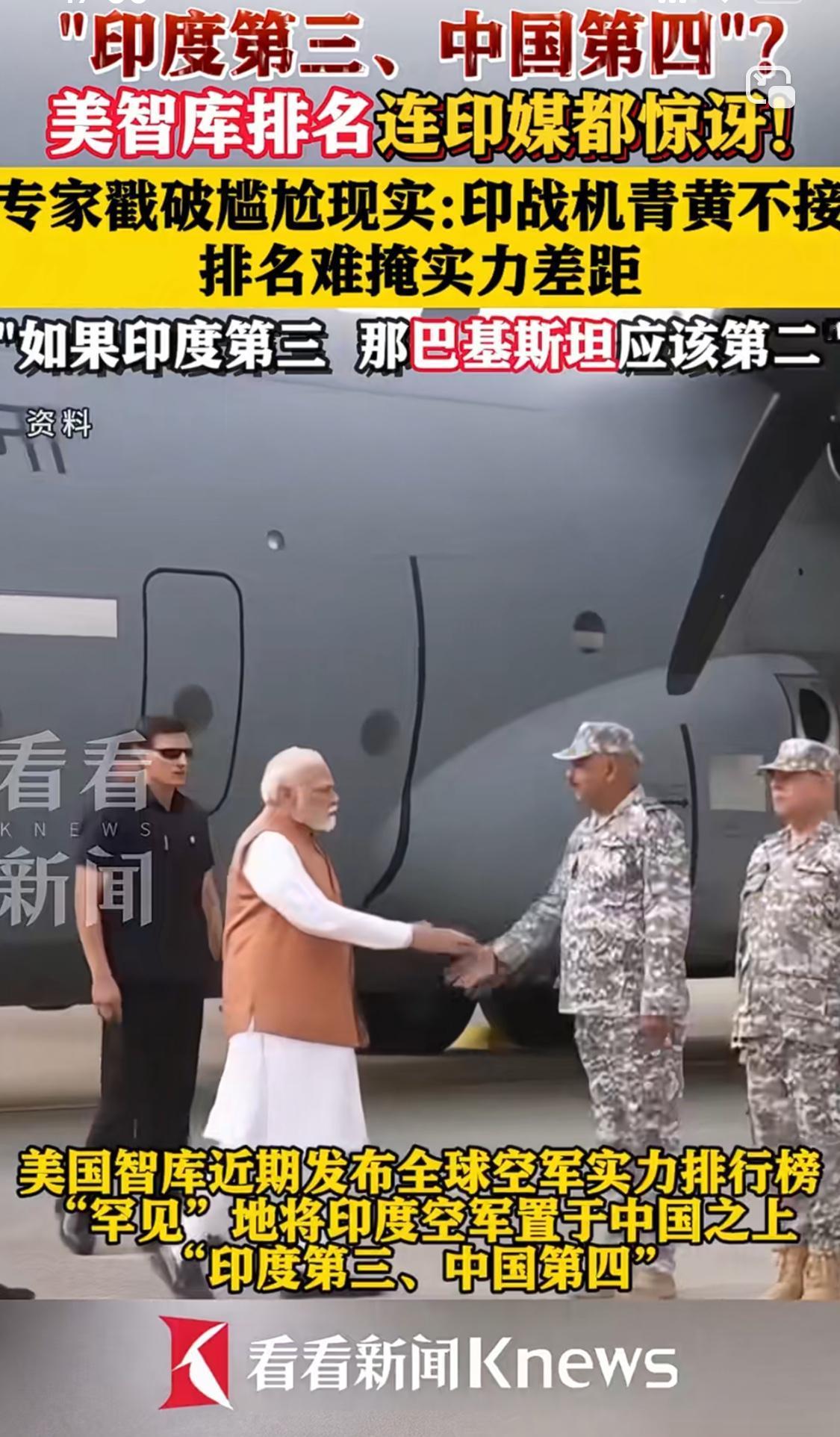 美国智库将印度空军实力排在美、俄之后位列全球第三,这下三哥终于开心了 在美国智库发布的了最新的2025全球空军实力排行榜,美国以242.9分断档第一,俄罗斯以114.2分排在第二,印度以69.4分排下第三,中国以63.8分排在第四,随后是日本、以色列、法国、英国、韩国意大利、澳大利亚、巴基斯坦空军…… 这份榜单的排名依据主要考虑结构平衡性、来源多样性等,而不是单纯考虑战斗机的数量和先进性。 按照它的逻辑,印度的“万国造”和拥有更高比例的教练机、直升机就显得非常吃香,而中国空军因战斗机占比过高(52.9%)、全自主且缺少实战就只能排在印度之后。本来因印巴5月份的空战让印度对我们多少有点畏惧,现在排名一出来,印度可算又可以支棱起来了。 要我说,这排名还是把我们排的高了,我们还需继续努力……